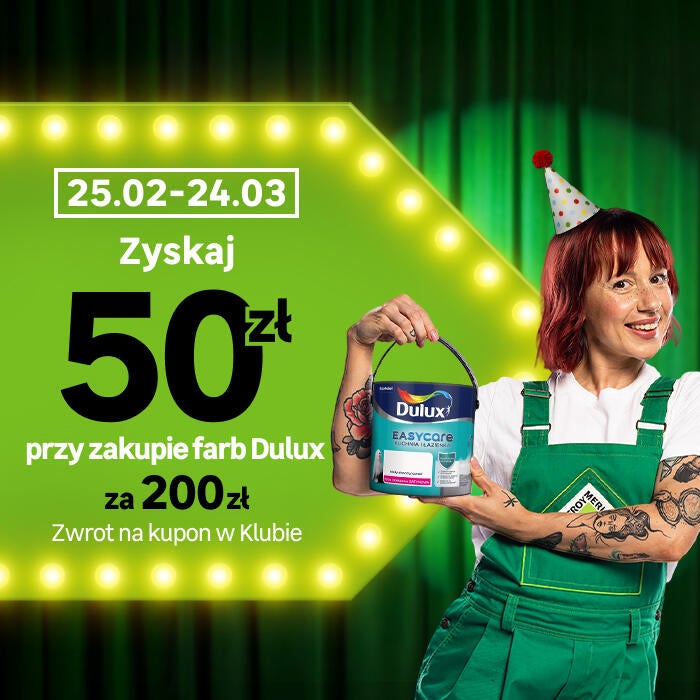 Kup wybrane farby Dulux za 200 zł, a otrzymasz 50 zł zwrotu na Kupon na kolejne zakupy. Kupon zostanie wygenerowany na Twoim koncie Klubowicza. Promocja obejmuje zarówno sklepy stacjonarne, jak i sklep internetowy. Oferta ważna od 25.02.2026 r. do 24.03.2026 r. tylko w Klubie DOM i PRO. Promocja dotyczy produktów, których sprzedawcą jest Organizator (Leroy-Merlin Polska Sp. z o.o.) i nie są nią objęte produkty sprzedawane przez innych sprzedawców na Marketplace dostępnym w Serwisie. Lista produktów objętych promocją w szczegółowym regulaminie.