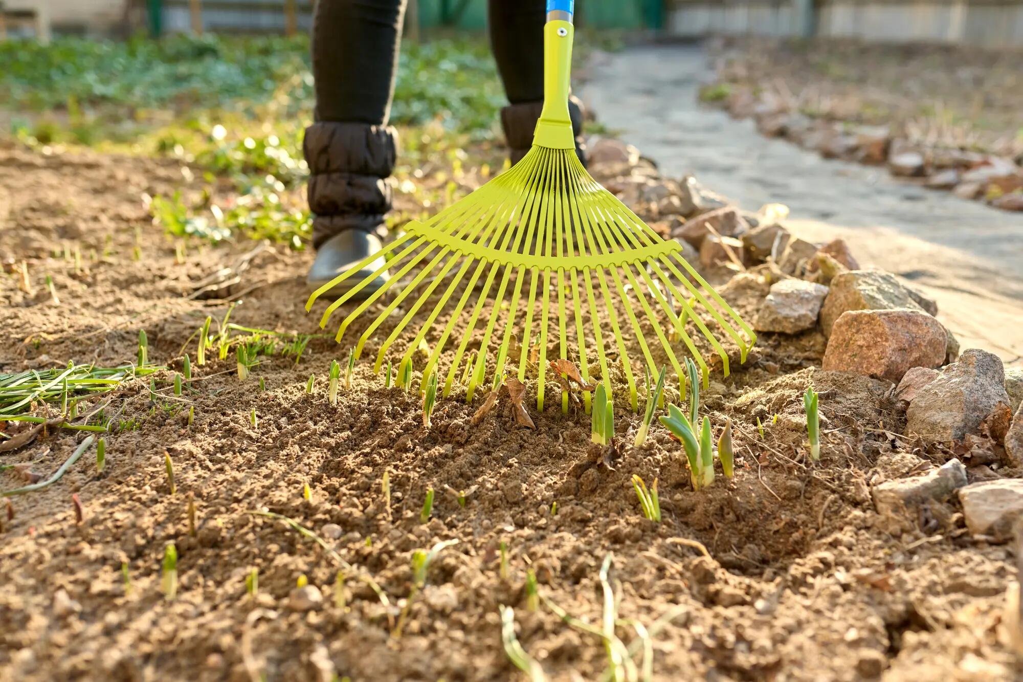 Wczesną wiosną warto zrobić też porządki na grządkach i rabatach: należy wygrabić suche resztki roślin oraz opadłe liście.