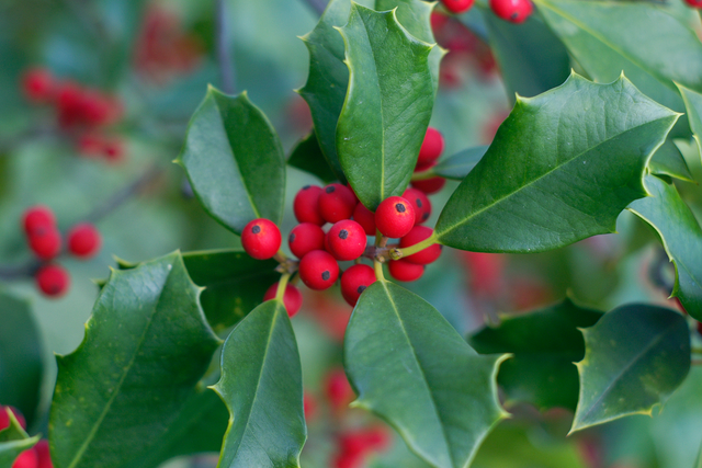 Do krzewów zimozielonych, które mają skórzaste, błyszczące, ciemnozielone liście i barwne owoce, zaliczyć możemy ostrokrzew. Sztywne, kłujące listki tej rośliny wykorzystuje się czasem do robienia stroików na Święta Bożego Narodzenia. Szczególnie ładnie wyglądają gałązki obsypane czerwonymi lub żółtymi, kulistymi owocami (zdarzają się także owoce czarne). Ostrokrzew należy do roślin dwupiennych (egzemplarze żeńskie muszą zostać zapylone pyłkiem z egzemplarzy męskich). Aby pojawiły się owoce, osobniki o kwiatostanach żeńskich powinny rosnąć nie dalej niż 20-30 m od osobników o kwiatostanach męskich.