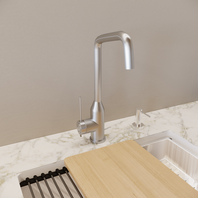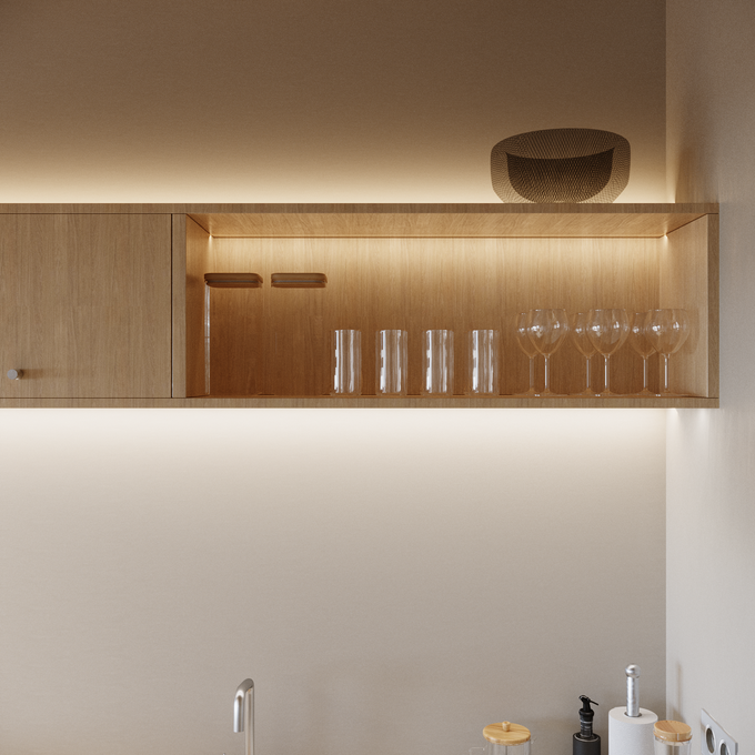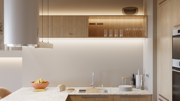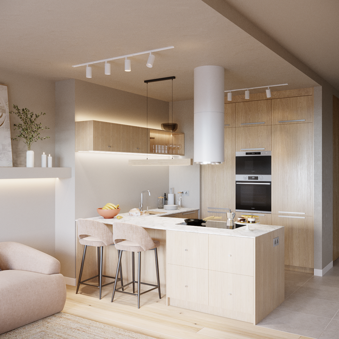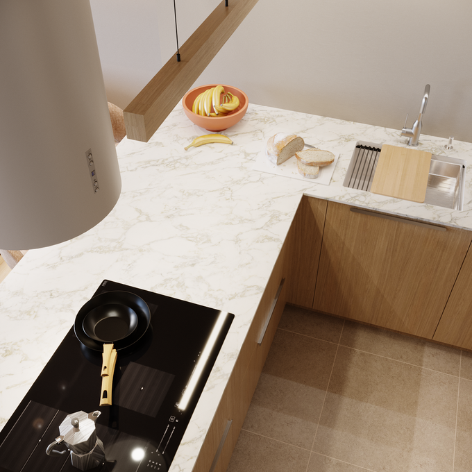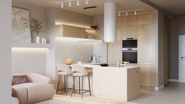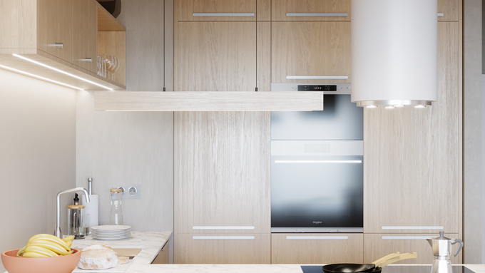 Równie szerokie możliwości dają wybory dotyczące ścian, blatów czy podłogi. Do mebli kuchennych z jasnego drewna pasują zarówno białe, czarne, jak i szare blaty, płytki oraz gresy. My postawiliśmy na gres w ciepłym, beżowym odcieniu oraz blat imitujący marmur. To ponadczasowe połączenie, które będzie prezentowało się doskonale mimo upływu lat.