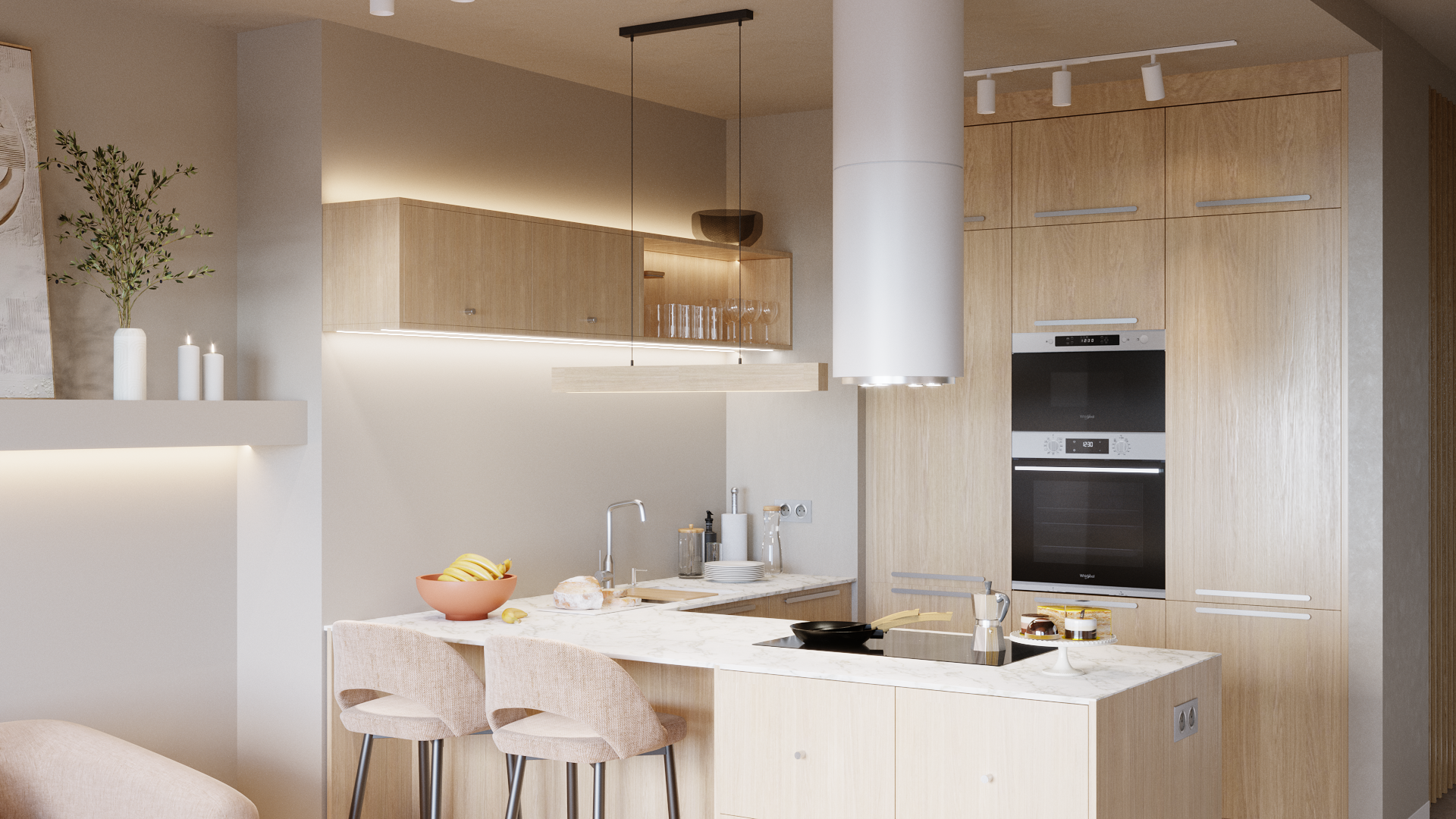 Dzięki takim połączeniom kuchnia z jasnego drewna otwarta na salon, zyskuje elegancki i ponadczasowy styl, który nigdy się nie znudzi.