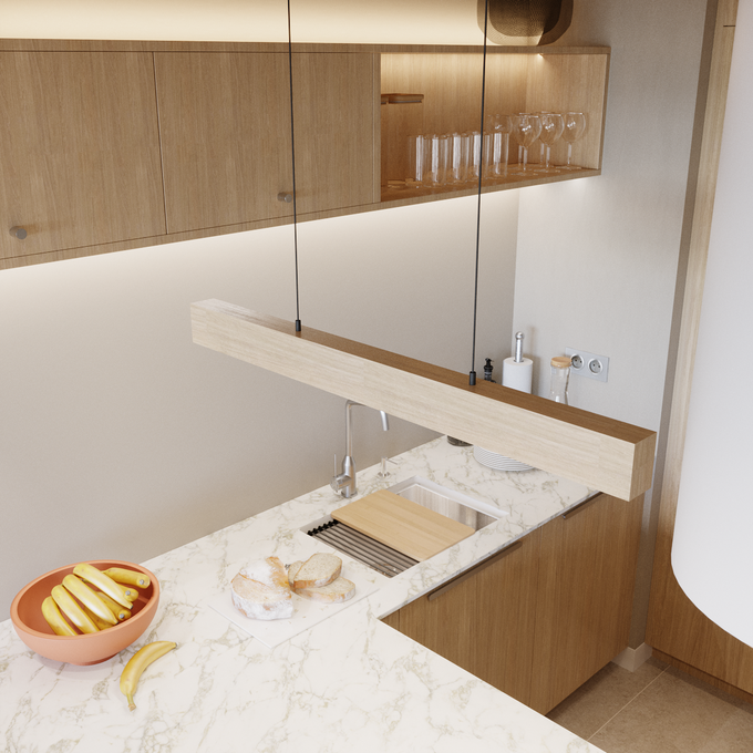 • Funkcjonalne strefy robocze – na wyspie można zaplanować płytę grzewczą, dodatkowy blat do pracy lub zlew. To świetny sposób na zwiększenie ergonomii kuchni.