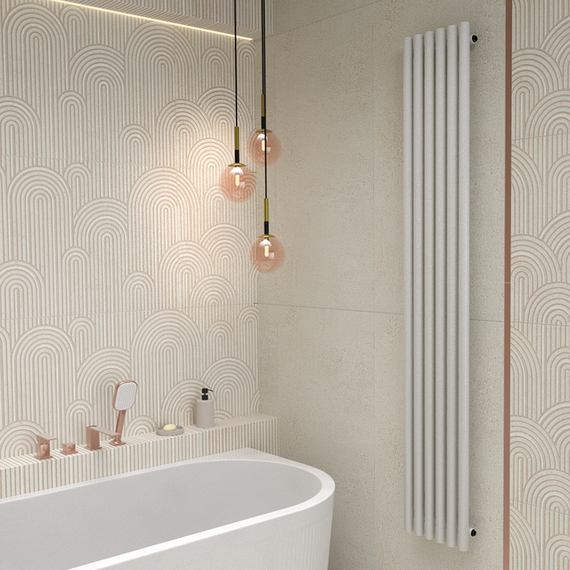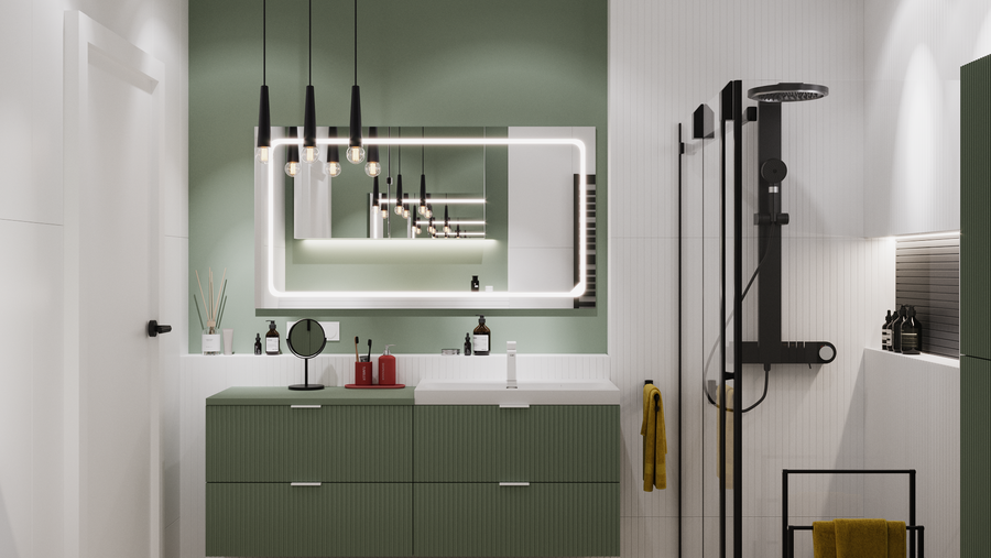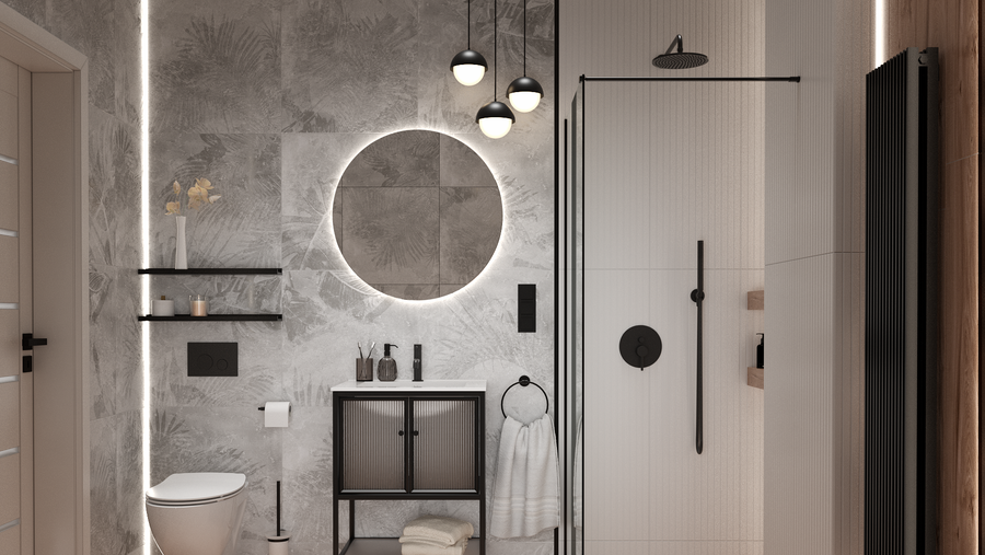 W przypadku łazienki z dekorem na ścianie światło pełni dodatkową funkcję – podkreśla zaokrąglone wzory i reliefy, uwydatniając jego dekoracyjny charakter i dodając aranżacji wyjątkowego wyrazu.