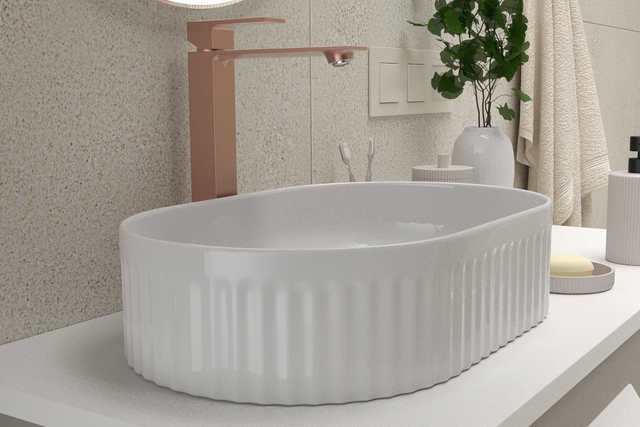 Ustawiona na minimalistycznej, wiszącej szafce umywalka także przyciąga wzrok. Jest subtelnym, ale wyraźnym akcentem dekoracyjnym. Jej pionowe żłobienia tworzą interesującą grę światła i cienia, a w połączeniu z miedzianą baterią tworzą duet, który łączy funkcjonalność z wyrafinowanym designem. Tego typu detale sprawiają, że łazienka zyskuje indywidualny charakter – nowoczesny, ale przytulny, spójny, ale nieprzewidywalny.