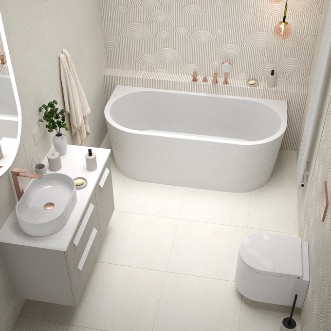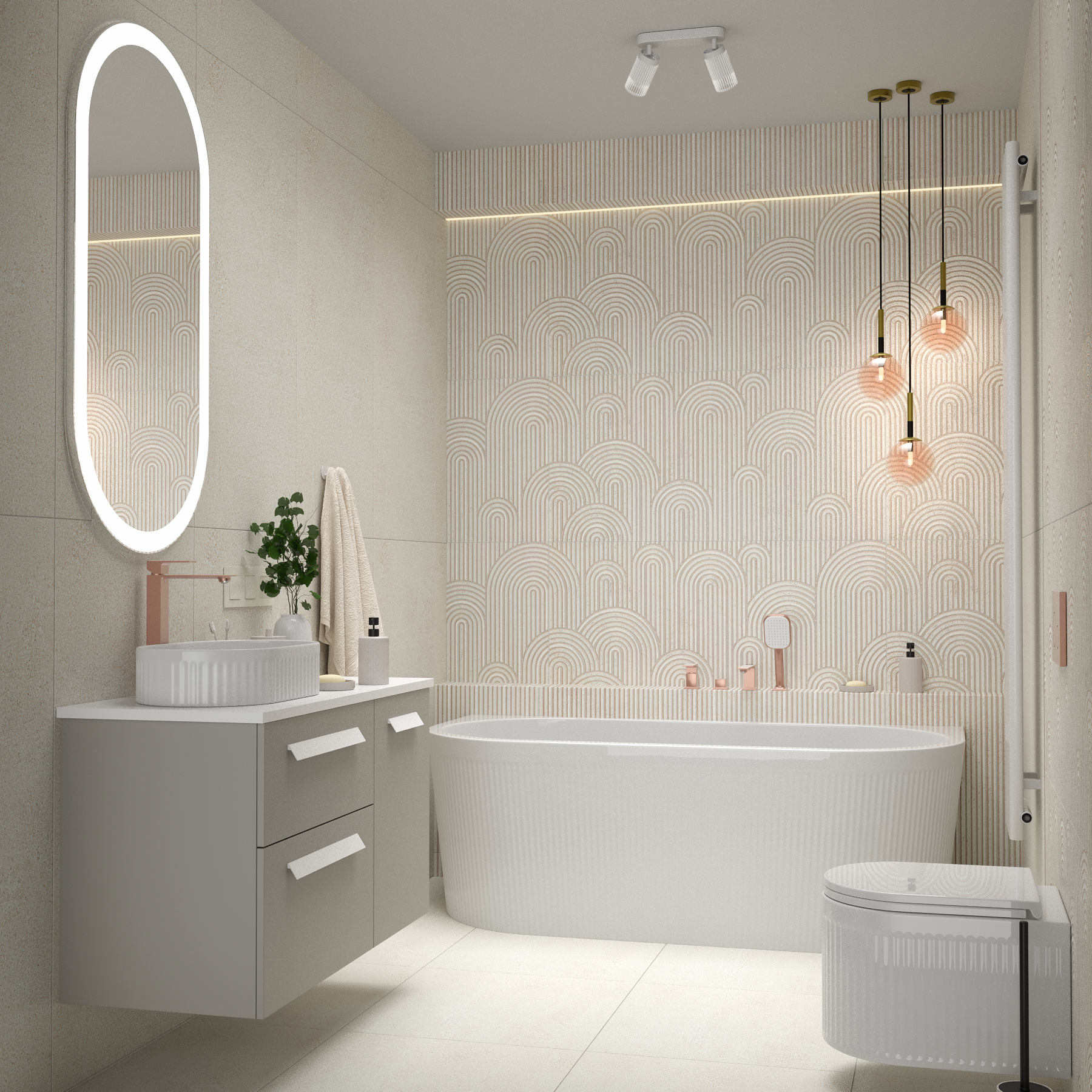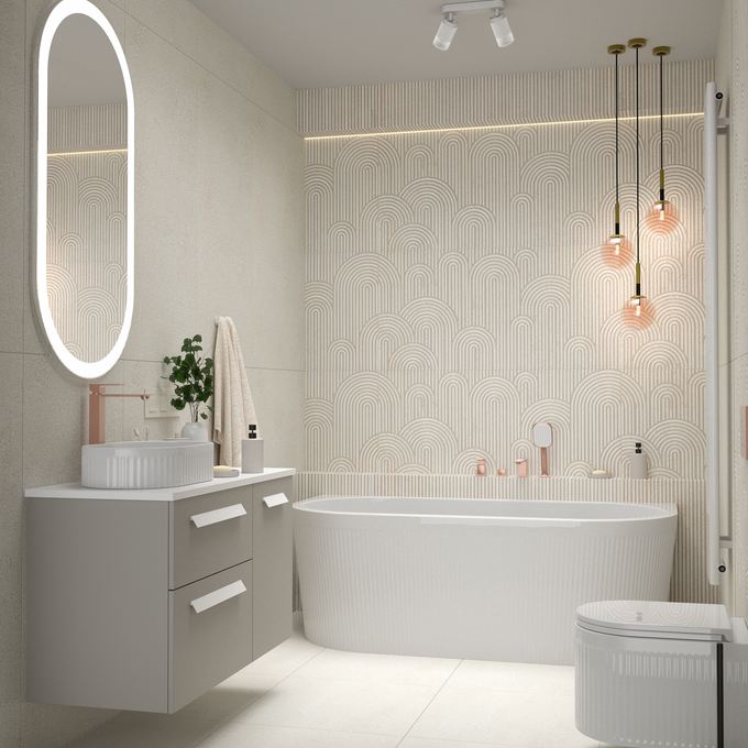 Centralnym punktem łazienki jest wanna wolnostojąca. Jej forma przyciąga wzrok, ale nie dominuje – subtelnie łączy funkcjonalność z estetyką nowoczesnego spa. Ustawiona na tle dekoracyjnego gresu z delikatnymi zaokrągleniami, wanna tworzy wyrazisty, ale harmonijny akcent wnętrza. Światło podkreśla strukturę płytek, dodając całości głębi i elegancji. Beżowe tony płytek otulają przestrzeń, potęgując wrażenie ciepła i harmonii. Połączenie z armaturą w kolorze miedzi nadaje aranżacji charakteru i wprowadza delikatny akcent luksusu. Ciepły połysk metalu pięknie komponuje się z beżową paletą barw, a jednocześnie kontrastuje z matową powierzchnią gresu, tworząc eleganczne zestawienie materiałów.