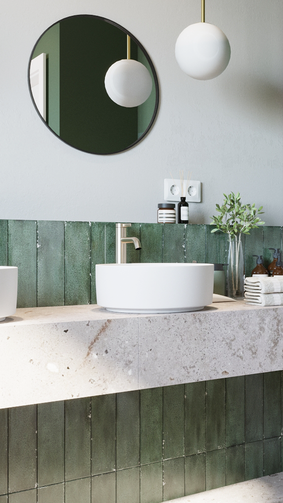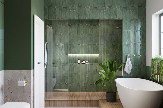 Nową bazą neutralności stają się również wyciszające zielenie – w odcieniach szałwiowym i oliwkowym, doskonale wpisujące się w ideę Biophilic. Choć w armaturze nadal dominuje matowa czerń, na akcenty wybieramy nasycone kontrasty, takie jak granat, burgund czy antracyt. Coraz śmielej rozgości się w łazienkach pastelowa, kolorowa ceramika podkreślona kontrastową fugą.
