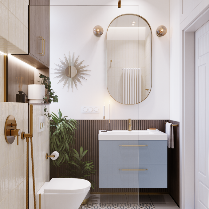 • złote, błyszczące dodatki, które sprawdzą się tym bardziej, jeśli w łazience panuje styl glamour lub klasyczny;
