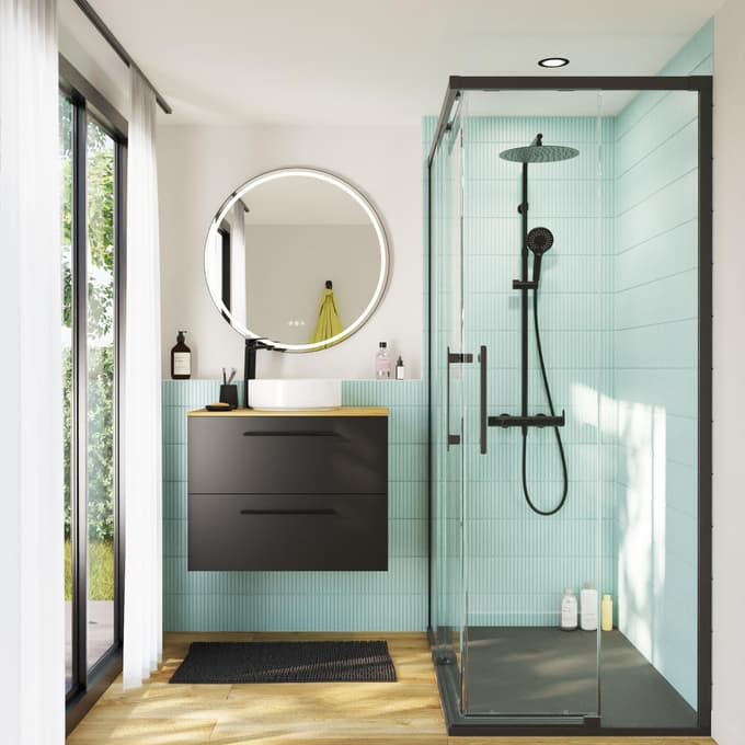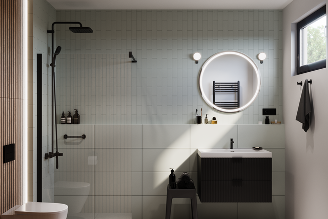Wielbicielom nowoczesnego stylu proponujemy nieco odważniejsze rozwiązanie. Zielona mozaika na ścianie w połączeniu z czarną szafką i armaturą tworzy ciekawy, designerski kontrast! Dodatkowo, podświetlane lustro i kolorowe ręczniki podkręcą efekt „wow” w łazience.