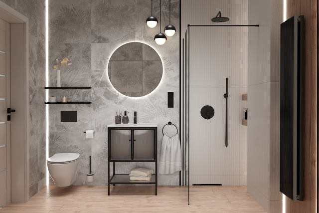 • czarną armaturę, która będzie kontrastować z białymi lub jasnoszarymi płytkami;