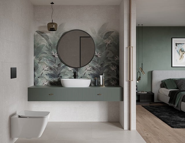Łazienka otwarta na sypialnię powinna stylistyczne współgrać z sąsiadującym pomieszczeniem. Pamiętaj o spójnej kolorystyce i zastosowaniu podobnych materiałów np. gres z sypialni wykorzystaj też na podłodze w łazience.