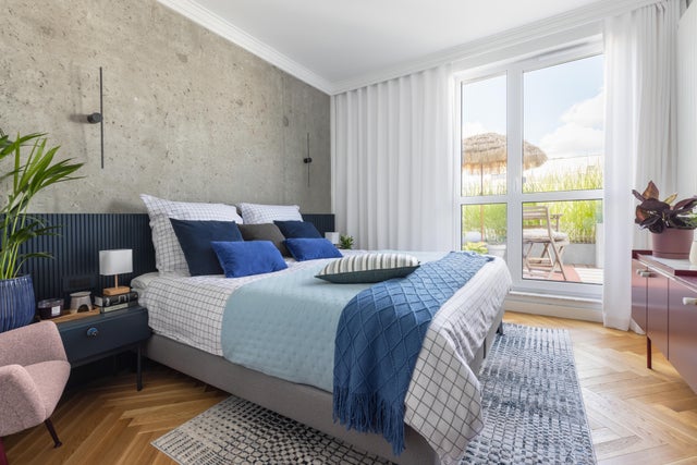 Podłoga w nowoczesnej sypialni powinna być jednolita, aby niepotrzebnie nie przyciągała uwagi. Zrezygnuj z drewna o wyraźnym usłojeniu oraz patchworkowych płytek ceramicznych. Skoncentruj się raczej na: surowym, przecieranym betonie, jednokolorowych kafelkach, pozbawionych wzorów, a także odpornych na ścieranie panelach winylowych.
