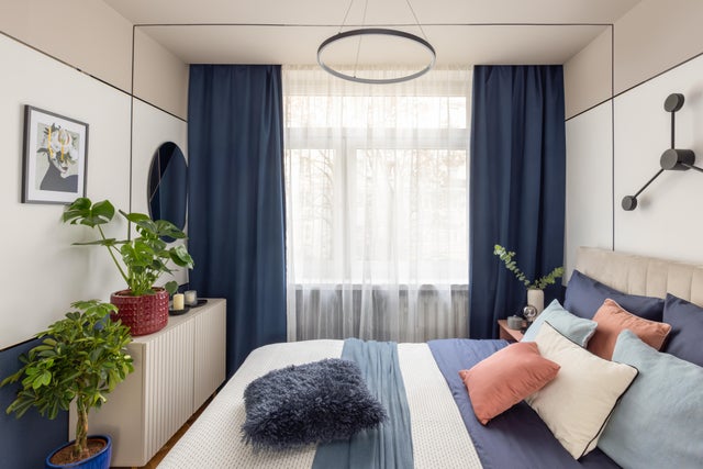W zakresie kontroli światła i prywatności, popularnością cieszą się rolety i żaluzje. Planując sypialnię z zasłonami, zdecyduj się na takie, które zostały uszyte z jednokolorowego materiału: półprzezroczystego lub wręcz przeciwnie, mięsistego i doskonale zaciemniającego pokój. Zasłony powinny sięgać do samej podłogi lub kończyć się kilka centymetrów nad nią.