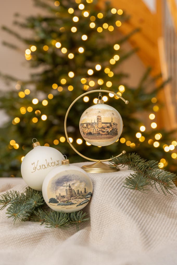 Polecamy wybrać piękny, jasny obrus, który stanie się neutralnym tłem dla reszty dekoracji. Aby urozmaicić nakrycie stołu, zestaw go z bieżnikiem w kontrastującym kolorze, np. szarym lub zielonym. Na stole możesz postawić wazon z bukietem oraz świąteczny stroik. Jeśli Twój stół jest mały, rozważ zawieszenie kompozycji pod sufitem! Zielona girlanda z bombkami z pewnością doda oryginalności i uroku.