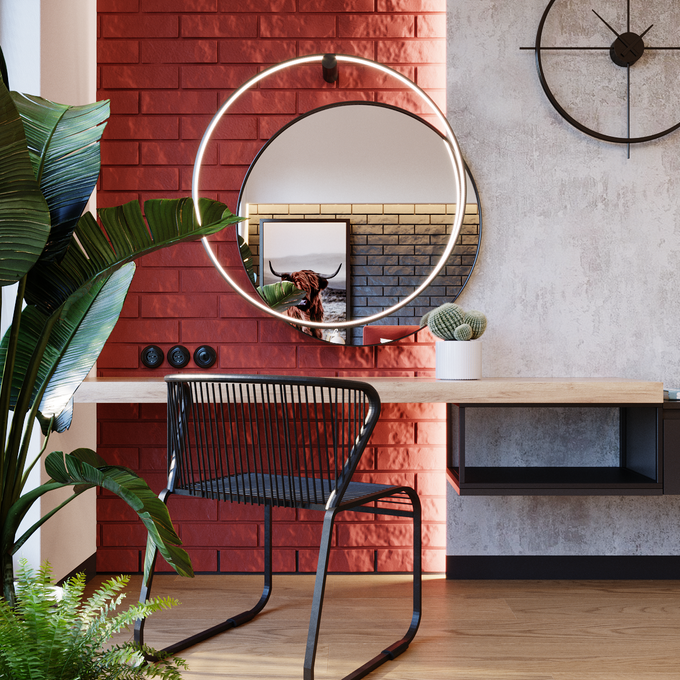 Ogromnie ważny element w aranżacji każdej sypialni stanowią też same ściany. Ich kolor i tekstura nadają ostatecznego charakteru wnętrzu. W naszym pomieszczeniu tynk betonowy oraz cegła w czerwonym kolorze świetnie kontrastują ze sobą, oświetlone dodatkowo paskiem LED. Ozdobę ściany stanowi również zegar oraz lustro z oświetleniem. Świetny efekt tworzą też odpowiednio dobrane drzwi bezprzylgowe, pomalowane na kolor ściany. Pomieszczenie wygląda wówczas na większe i jaśniejsze.