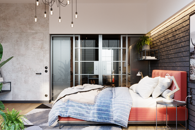 Ukryta garderoba w sypialni to funkcjonalne i wygodne rozwiązanie zarówno dla singla, jak i pary. Ta aranżacja sypialni to prawdziwy hit także ze względu na ciekawe i oryginalne ściany oraz mocny punkt całego wnętrza: miękkie, czerwone łóżko. Niezależnie, czy decydujesz się na łóżko 160x200 czy łóżko 140x200, wybierz kołdrę, która będzie nieco szersza niż sam materac, tak aby lekko opadała na boki łóżka. Da to elegancki efekt, a także będzie praktyczne w nocy, zwłaszcza jeśli pod jedną kołdrą będą spały dwie osoby.