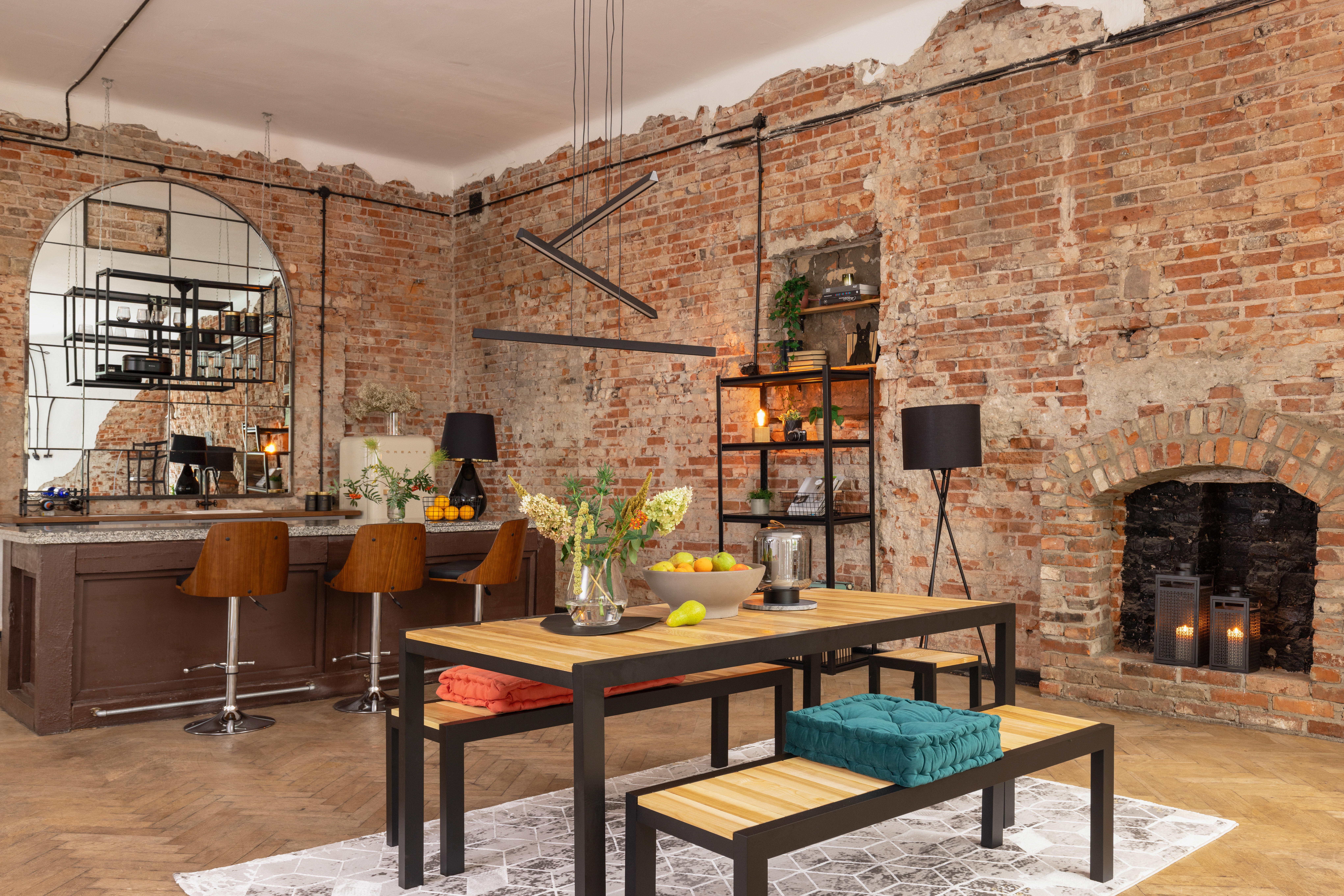 Styl loftowy w nowoczesnym wydaniu bardzo lubi się z kolorami w różnym wydaniu. Do stylu loftowego możesz dodać kolorowe poduszki, kolorowe szkło, a także dywany, zasłony czy dodatki na półki.