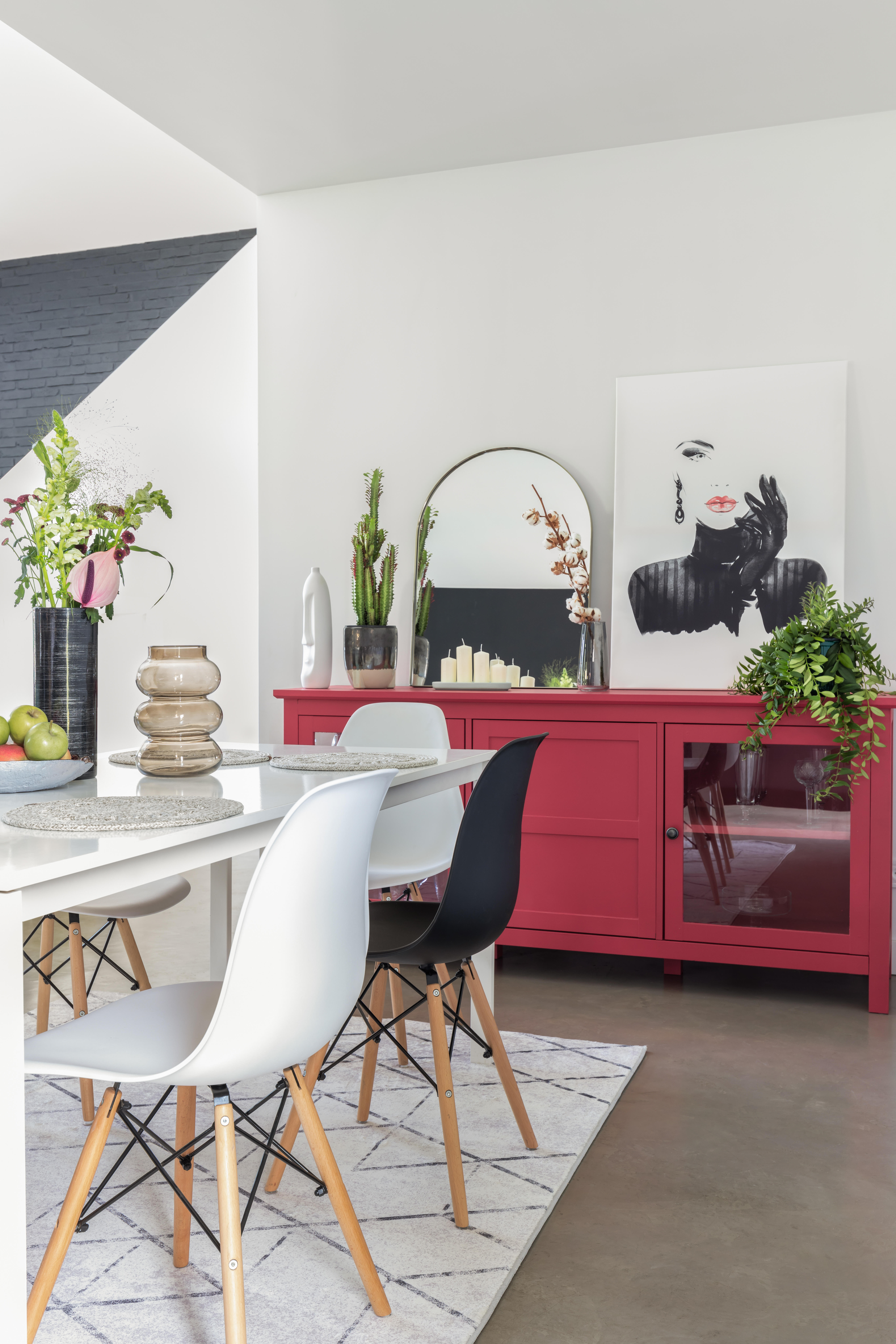 Świetnym pomysłem na zaprojektowanie przestrzeni jest również stworzenie jej na zasadzie kontrastu. Mogą to być kolory jasne i ciemne lub po prostu znajdujące się naprzeciw siebie na kole barw. Z czerwienią świetnie będzie więc współgrał kolor zielony, a także błękit, biel czy beż.