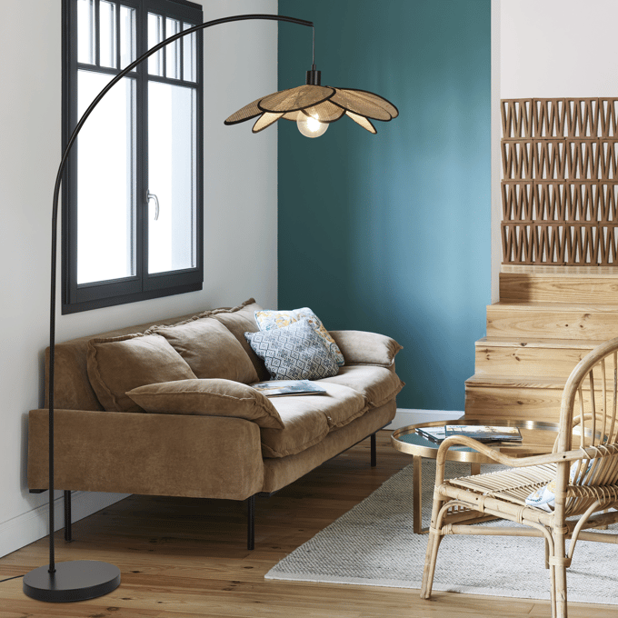 Oprócz górnego światła możesz postawić w swoim salonie modne lampy podłogowe. Ich światło docenisz zwłaszcza w pobliżu kanapy lub fotela. Mogą mieć abażur, klosz, dekoracyjne żarówki bądź reflektorki. Możesz też wybrać model, który ma regulowane ramię. Wysokość takiej lampy to zwykle 150-180 cm.