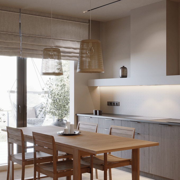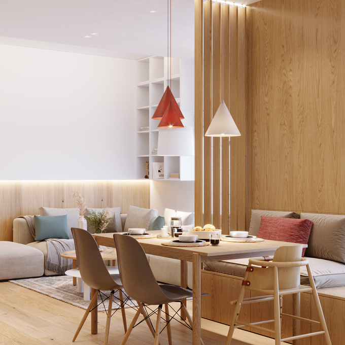 Salon często łączy się z kuchnią i jadalnią. Taki kącik warto dobrze doświetlić i wyeksponować go światłem. Najlepszą opcją jest umieszczenie lampy nad stołem. Dlatego już na etapie remontu zaplanuj okablowania i miejsce, w którym stanie stół. To ważne, by oprawa znajdowała się dokładnie nad nim. Ważny jest też sam kształt klosza – powinien kierować światło w dół. Wybierz lampy wiszące o kształcie odwróconej misy, ciętej kuli, stożka lub walca. Ciekawy efekt dają także ledowe lampy liniowe.