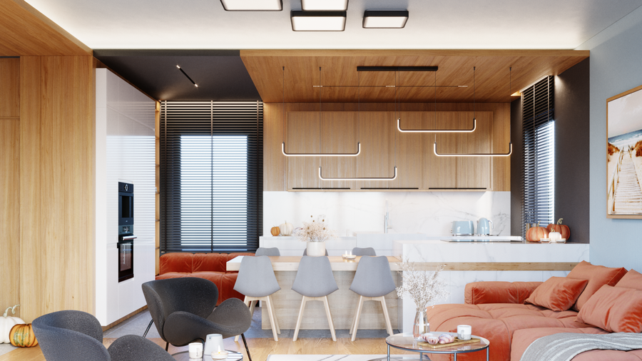 Oświetlenie do salonu ma zastąpić światło dzienne w pokoju. Najlepiej montuj je na środku pomieszczenia – tak, by doświetlić wszystkie strefy. Wyjątkiem są wnętrza o nietypowym kształcie. Jeżeli Twój salon ma skomplikowane kształty albo jeśli jest podzielony na strefy funkcjonalne, umieść punkty świetlne w każdej ze stref.