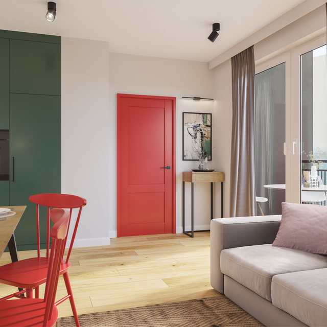 Coraz częściej we wnętrzach montuje się drzwi o kontrastującym kolorze, np. czerwonym, który nawiązuje jedynie do koloru dodatków w pomieszczeniu. Dzięki temu drzwi nadają wnętrzu charakteru.