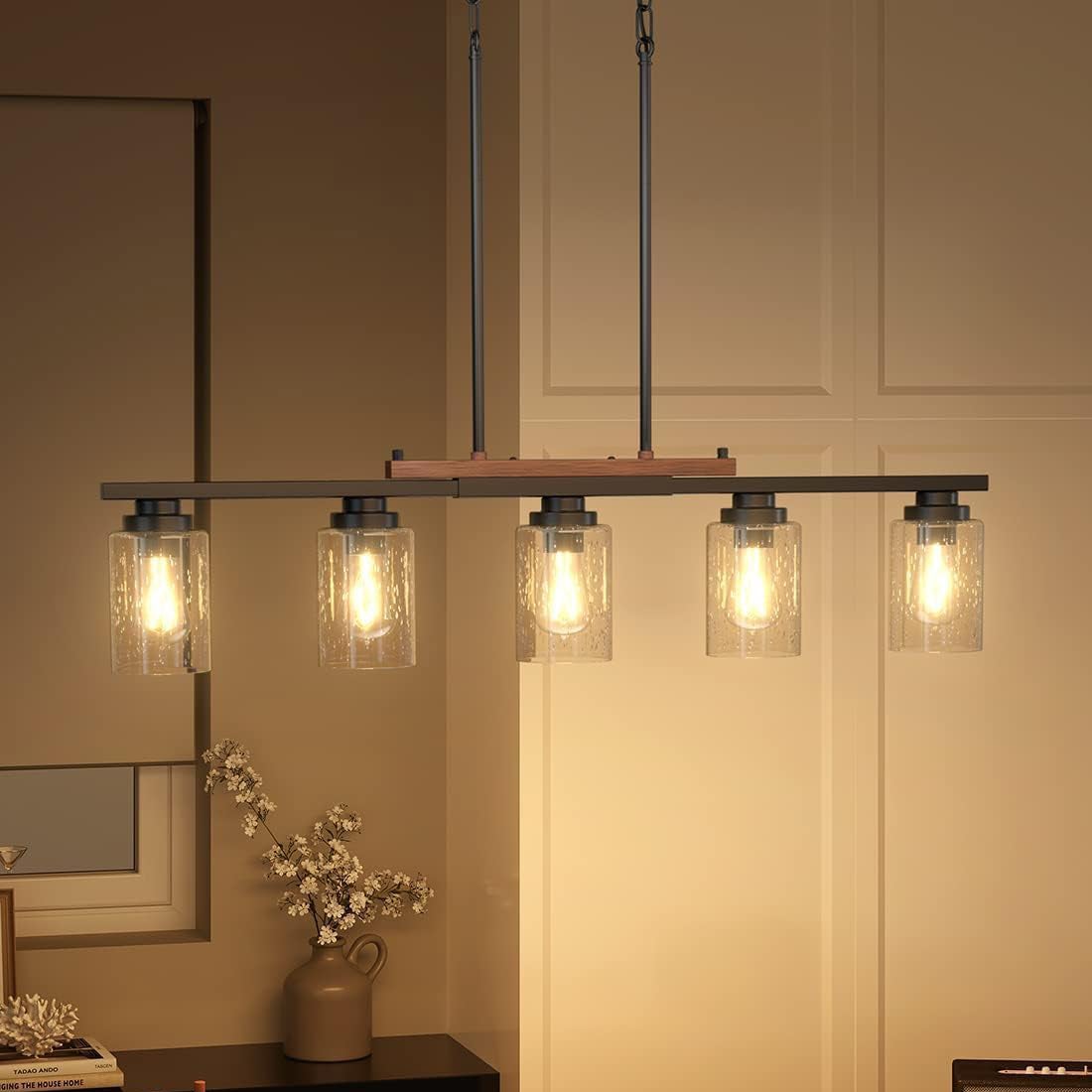 5-punktowy żyrandol kuchenny z regulowanymi prętami, rustykalny wystrój, metalowa lampa wisząca ze szklanym kloszem, oświetlenie wyspy kuchennej