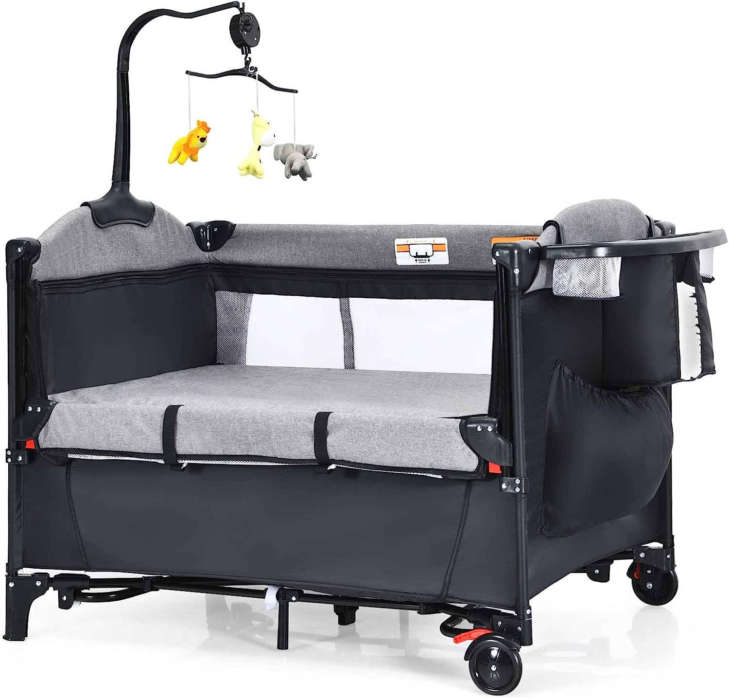 【Wielofunkcyjny design 5 w 1:】to wielofunkcyjne łóżeczko dziecięce łączy w sobie funkcje stolika do przewijania, kołyski, łóżeczka do współspania, łóżeczka i miejsca do zabawy, spełniając różne potrzeby. Trzy wiszące zabawki i pozytywka szybko uśpią dziecko. Kieszeń do przechowywania można zamontować na dowolnym podłokietniku, idealnie nadaje się do przechowywania pieluch, ręczników papierowych i innych przedmiotów niezbędnych na co dzień. Cechy: