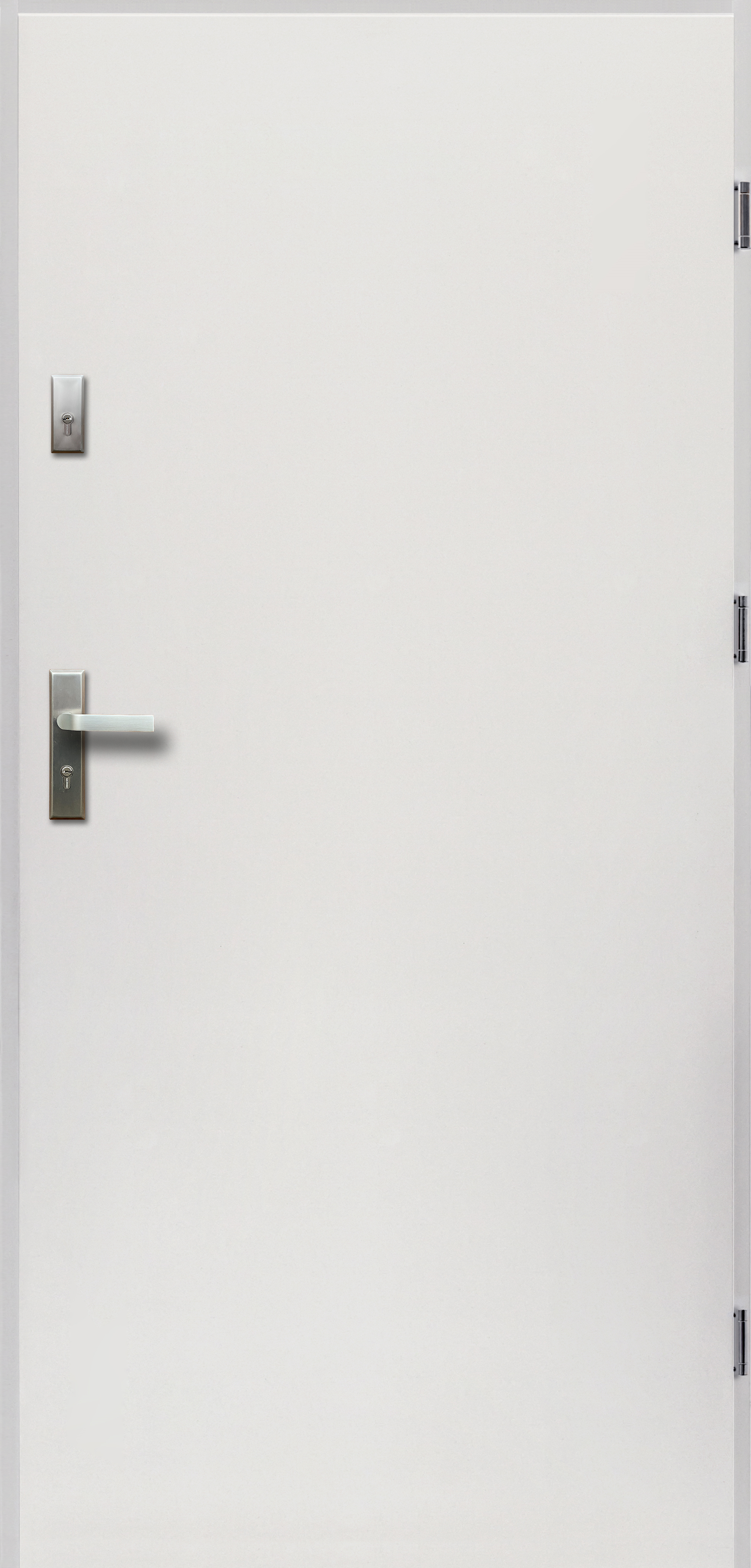 Drzwi wzmocnione otwierane na zewnątrz o grubości 68 mm wykonane z blachy stalowej pokrytej dekoracyjną folią PVC o strukturze i kolorze drewna, odporną na promieniowanie UV. Wypełnienie skrzydła stanowi płyta z polistyrenu spienionego. Skrzydło posiada uszczelki wzdłuż wszystkich czterech krawędzi. W uszczelki wyposażone są również ościeżnice oraz próg.