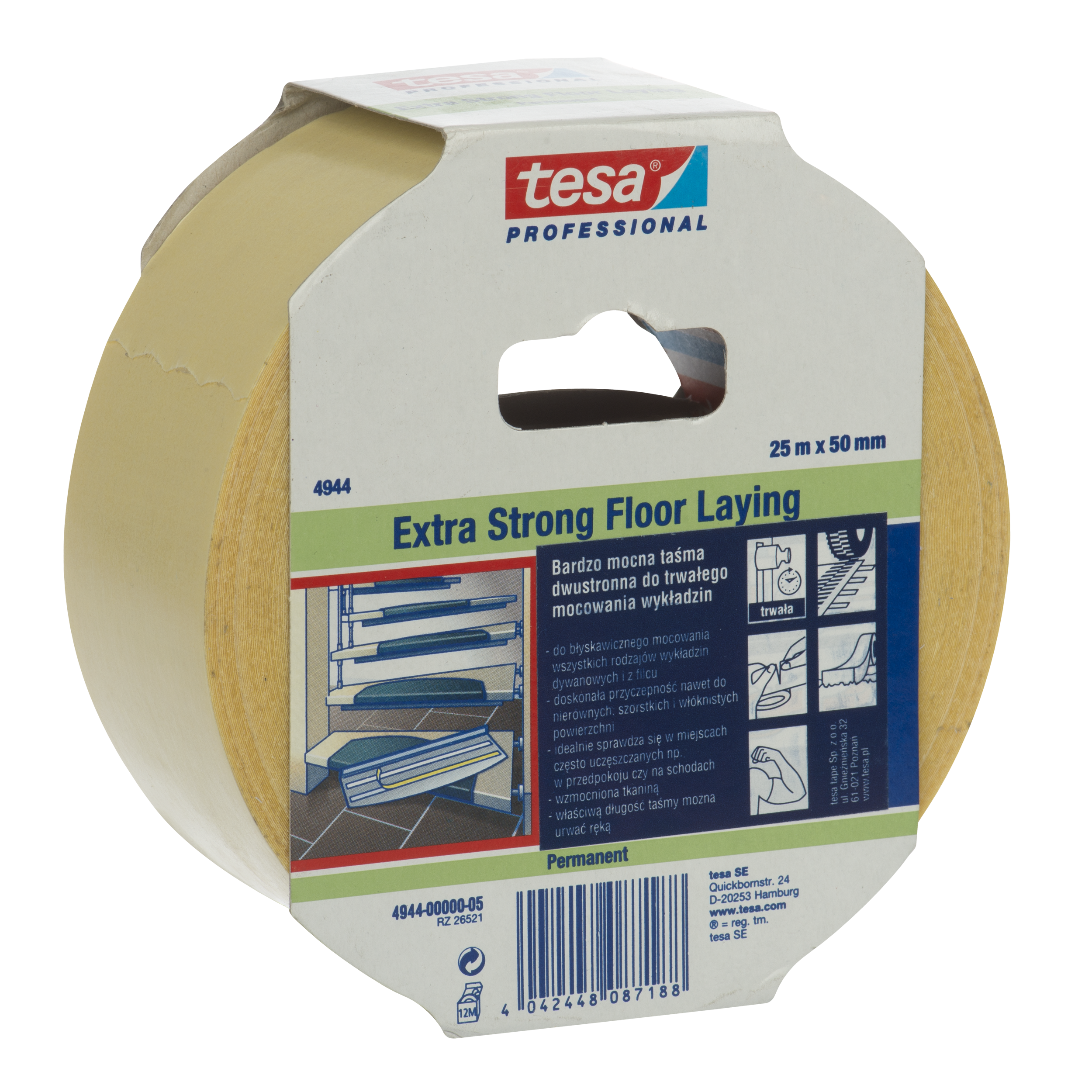 tesa® Professional 4944 to bardzo mocna, uniwersalna taśma do mocowania i układania wykładzin.
