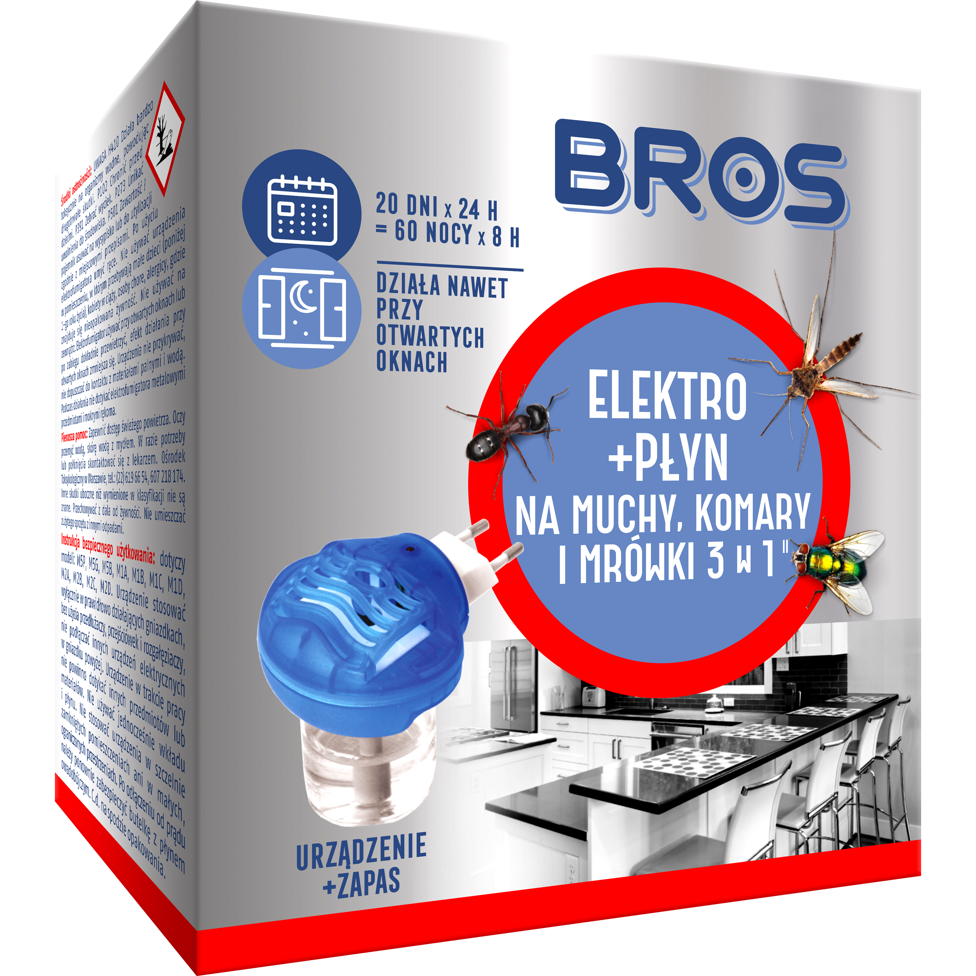 "Elektrofumigator z płynem o szerokim spektrum działania, do zwalczania much, komarów i mrówek. Stopniowo uwalniana substancja czynna chroni pomieszczenia zarówno w dzień, jak i w nocy, a dodatkowo zapobiega wlatywaniu kolejnych owadów. Jest skuteczny również przy otwartych oknach i włączonym świetle. Produktów biobójczych należy używać z zachowaniem środków ostrożności. Przed każdym użyciem należy przeczytać etykietę i informacje dotyczące produktu.