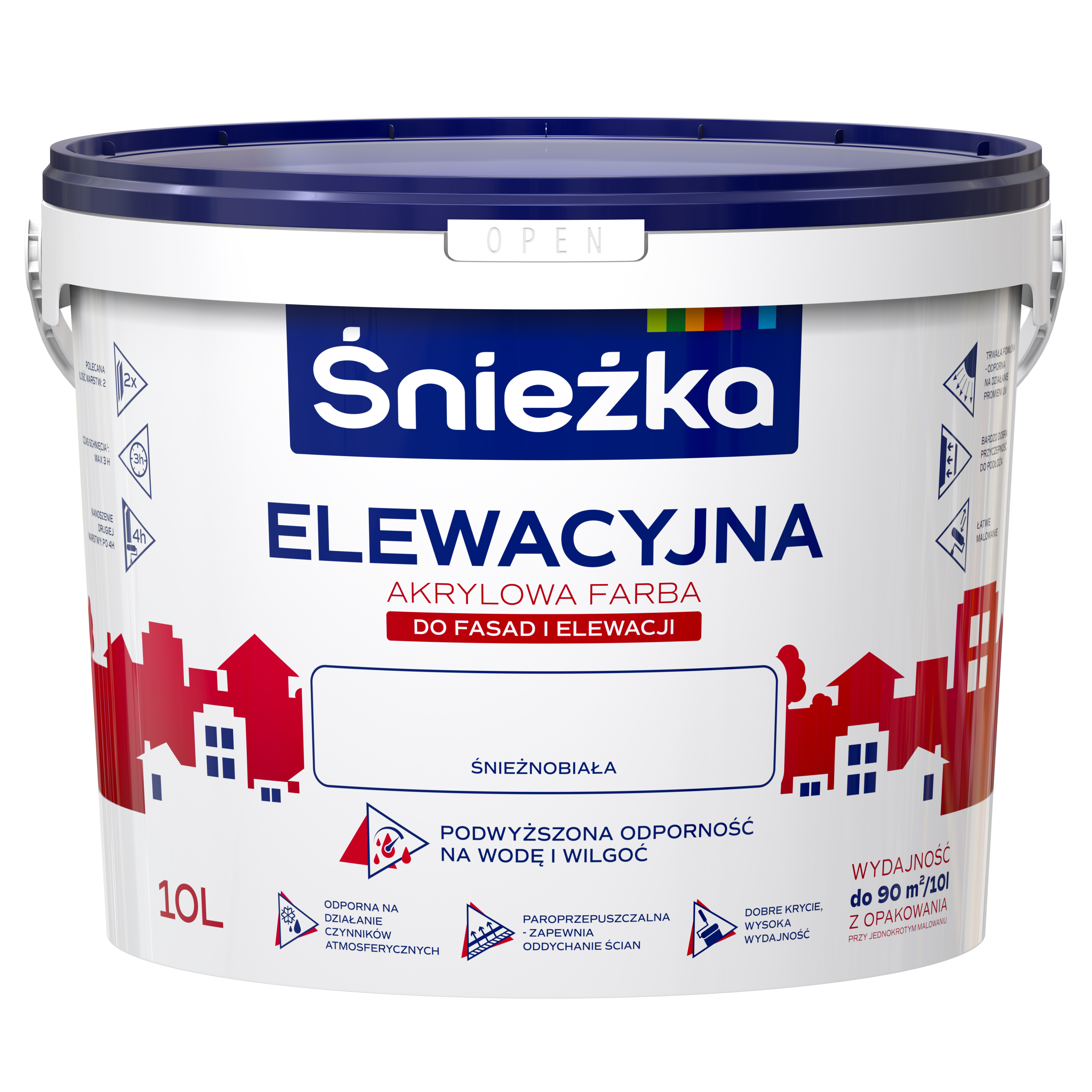 Śnieżka Elewacyjna to akrylowa farba przeznaczona do malowania fasad i elewacji. Żywica oraz wysokiej jakości wypełniacze wykorzystane do receptury sprawiają, że farba jest odporna na zmienne czynniki atmosferyczne. Śnieżka Elewacyjna to farba paroprzepuszczalna, zapewniająca „oddychanie ścian". Przeznaczona jest do dekoracyjnego i ochronnego malowania nowych elewacji i odnawianych budynków. Może być stosowana również wewnątrz pomieszczeń. Do podłoży cementowych, cementowo-wapiennych, gipsowych, płyt gipsowo-kartonowych, na beton. Nakładać za pomocą pędzla, wałka lub natrysku hydrodynamicznego.