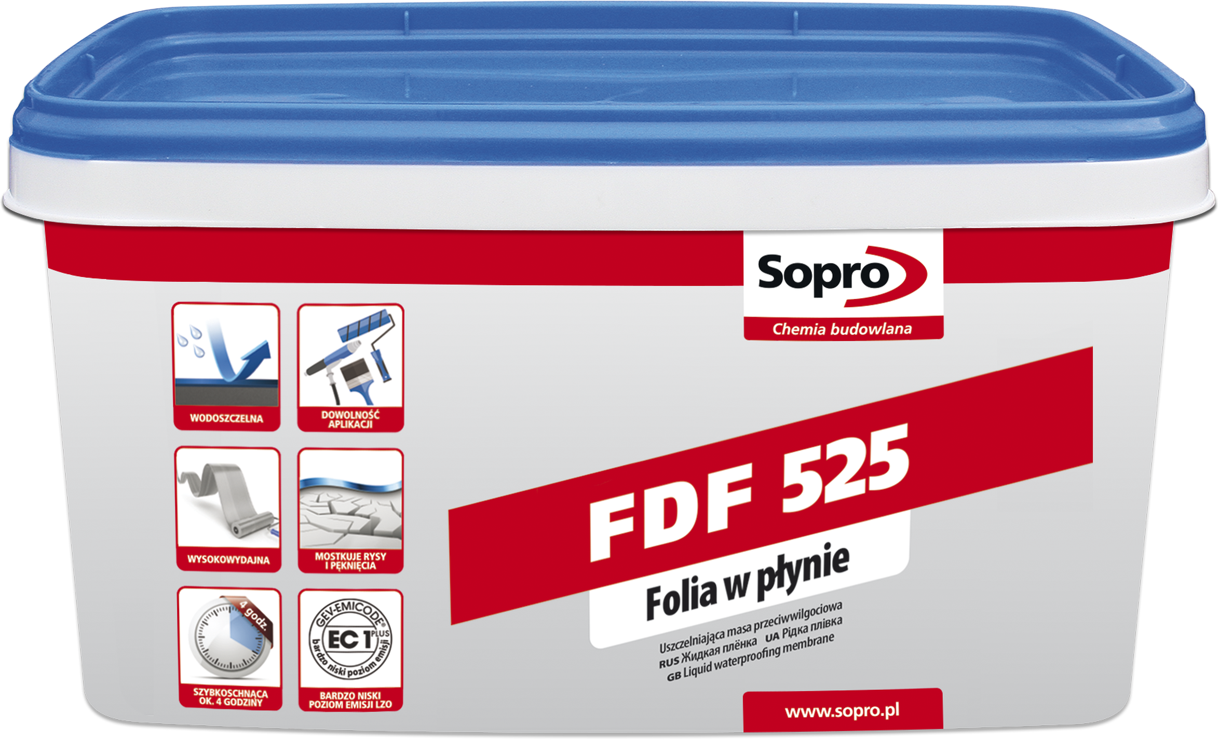 Folia w płynie FDF525 firmy Sopro to jednoskładnikowa powłoka, chroniąca przed wodą działającą bez ciśnienia w pomieszczeniach narażonych na wilgoć np. łazienki, natryski. Charakteryzuje się łatwą aplikacja na ściany i podłogi za pomocą wałka lub pędzla. Wysoko elastyczna powłoka cechuje się szybkim wysychaniem szybko maskuje uszkodzone powierzchnie, folię można stosować pod ogrzewanie podłogowe.