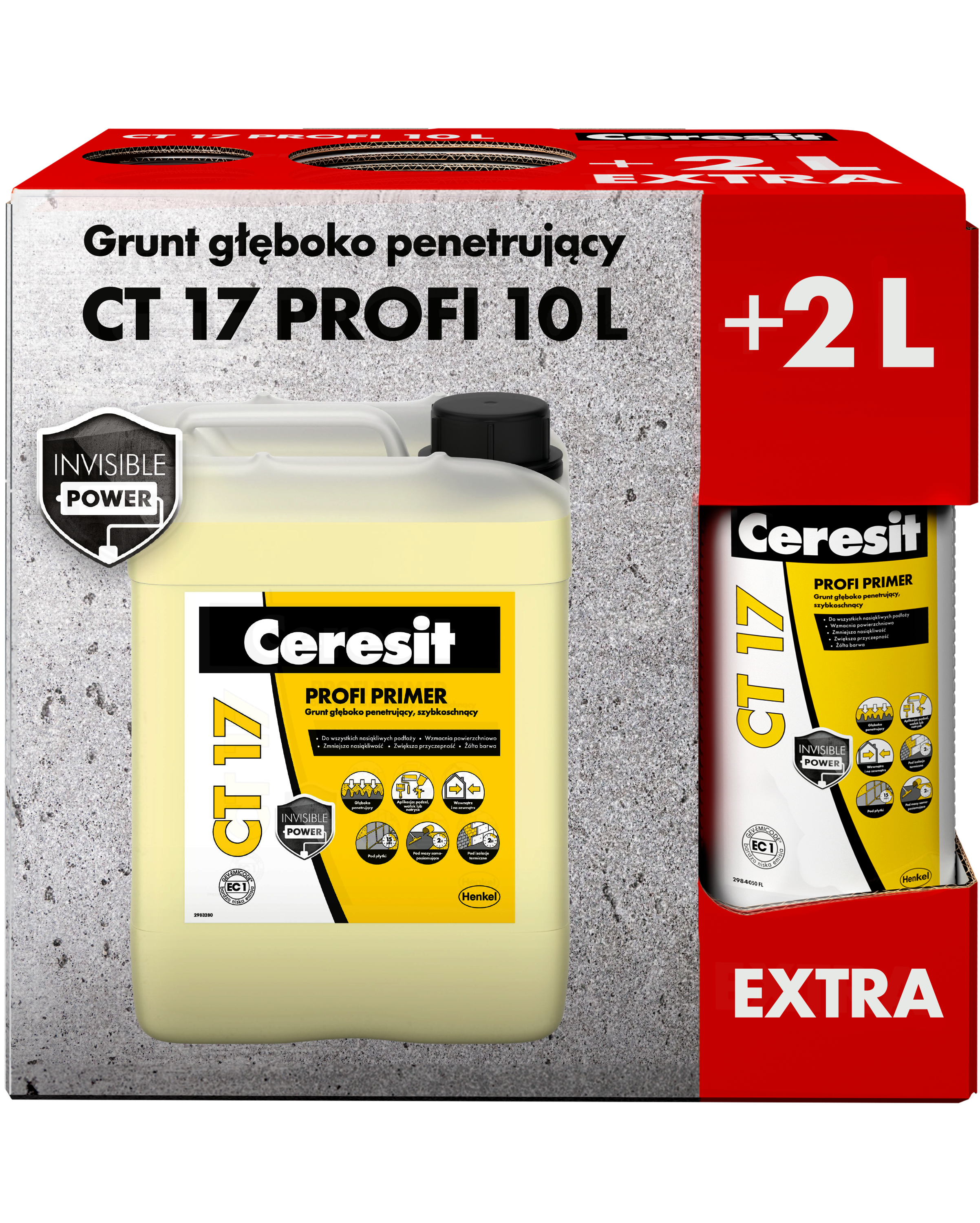CERESIT® CT 17 PROFI służy do gruntowania podłoży wewnątrz i na zewnątrz budynków przed mocowaniem płytek ceramicznych, wylewaniem posadzek, mocowaniem wykładzin podłogowych i mocowaniem płyt izolacji termicznej. Zagruntowane podłoża mają mniejszą nasiąkliwość, co zapobiega zbyt szybkiemu przesychaniu zapraw klejących, posadzek czy tynków. Preparat wnika głęboko w podłoże i wiąże ziarna kruszywa przez co wzmacnia powierzchniowo.