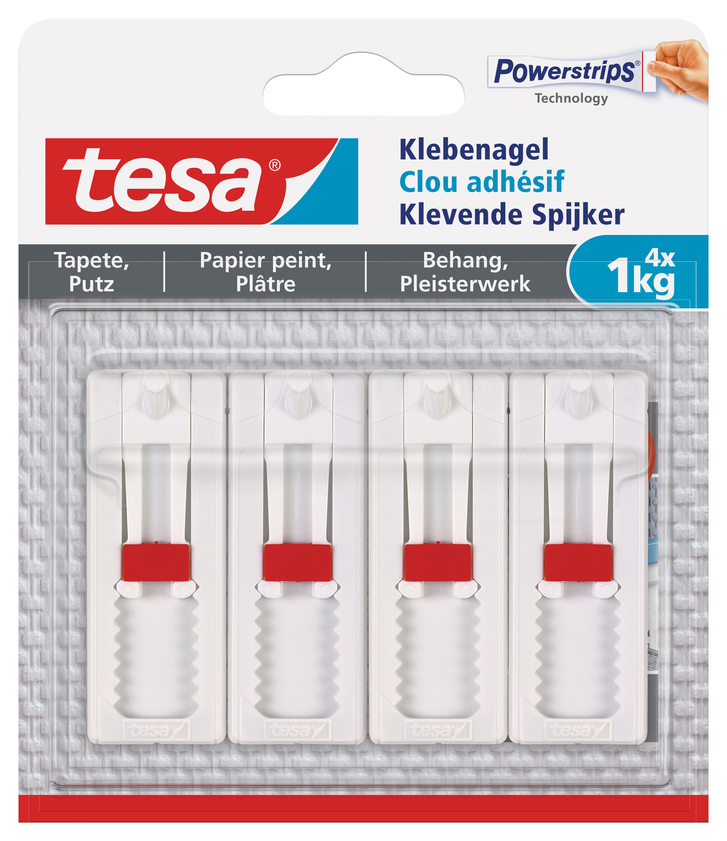 Gwoździe samoprzylepne regulowane 4 szt. Tesa ułatwiają montaż przedmiotów o masie do 1 kg. Przeznaczone są do montażu obrazów na powierzchniach delikatnych i fakturowanych. Funkcja regulacji wysokości umożliwia wyrównany pionowy montaż obrazków.