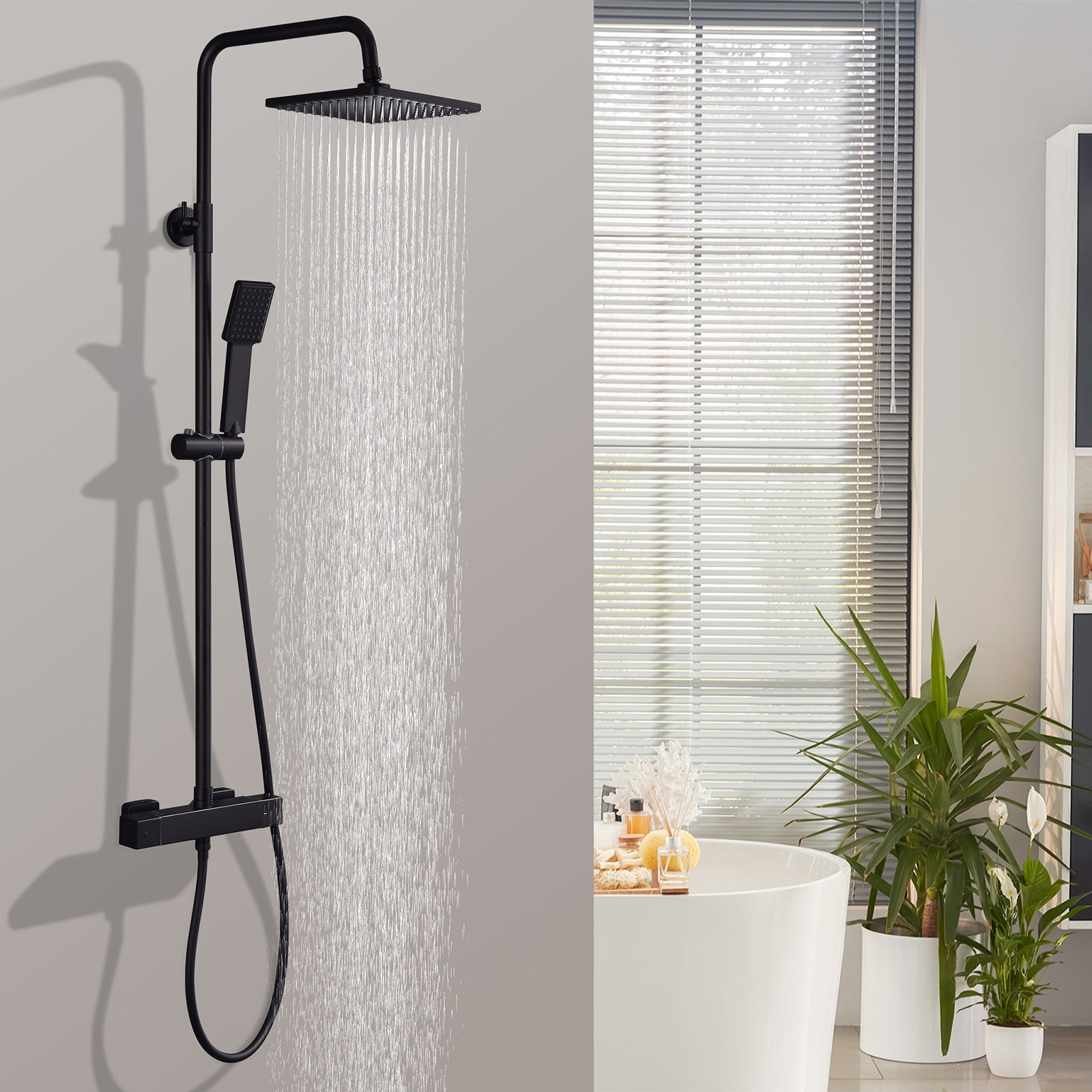 HOMELODY Czarna termostatyczna kolumna prysznicowa, zestaw prysznicowy z termostatem i główką prysznicową, regulowana wysokość