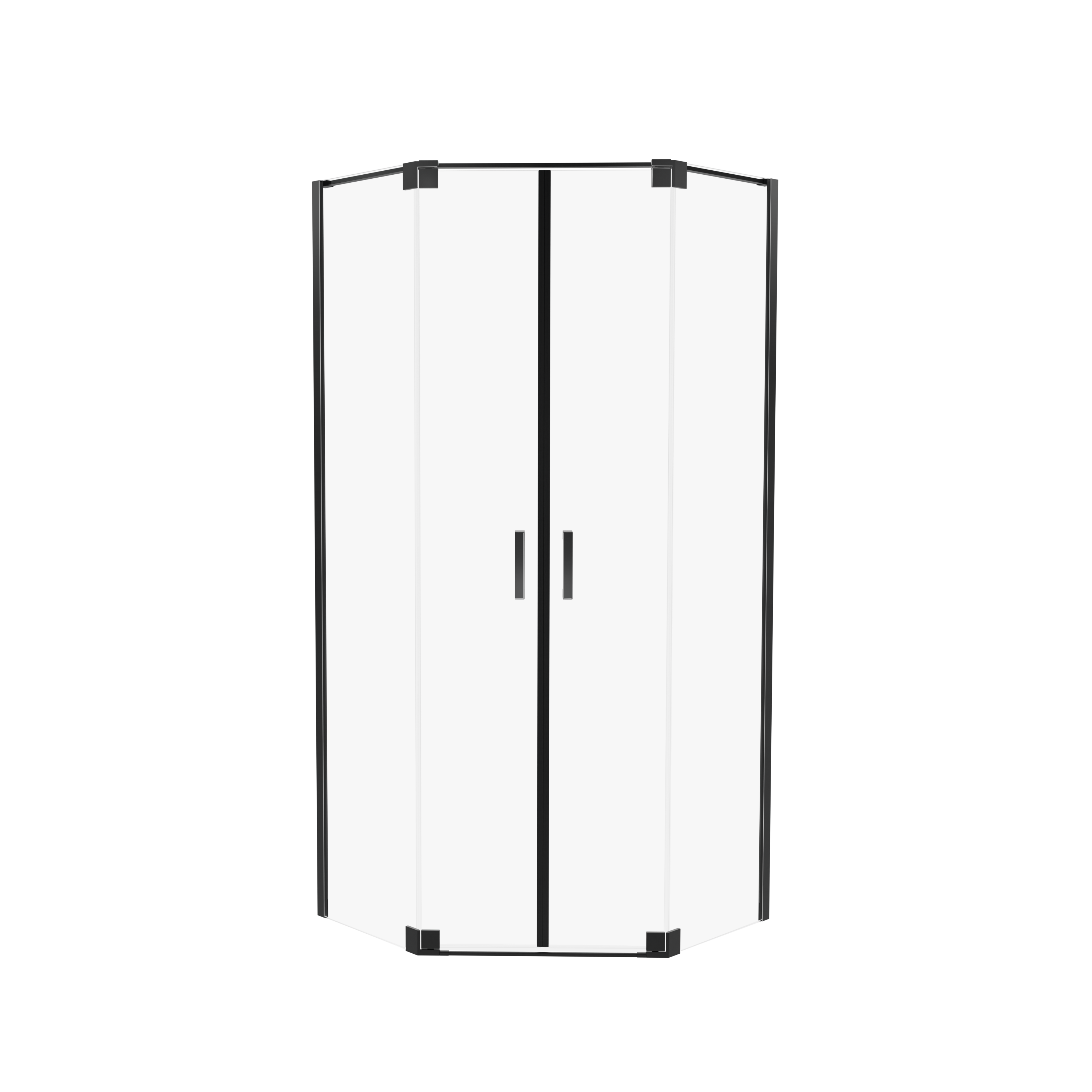 Kabina pięciokątna , drzwi podwójne uchylne obustronnie (ne zewnątrz i do środka) Profile przyścienne z krytymi mocowaniami montażowymi i regulacją krzywizn, metalowe dwupunktowe uchwyty