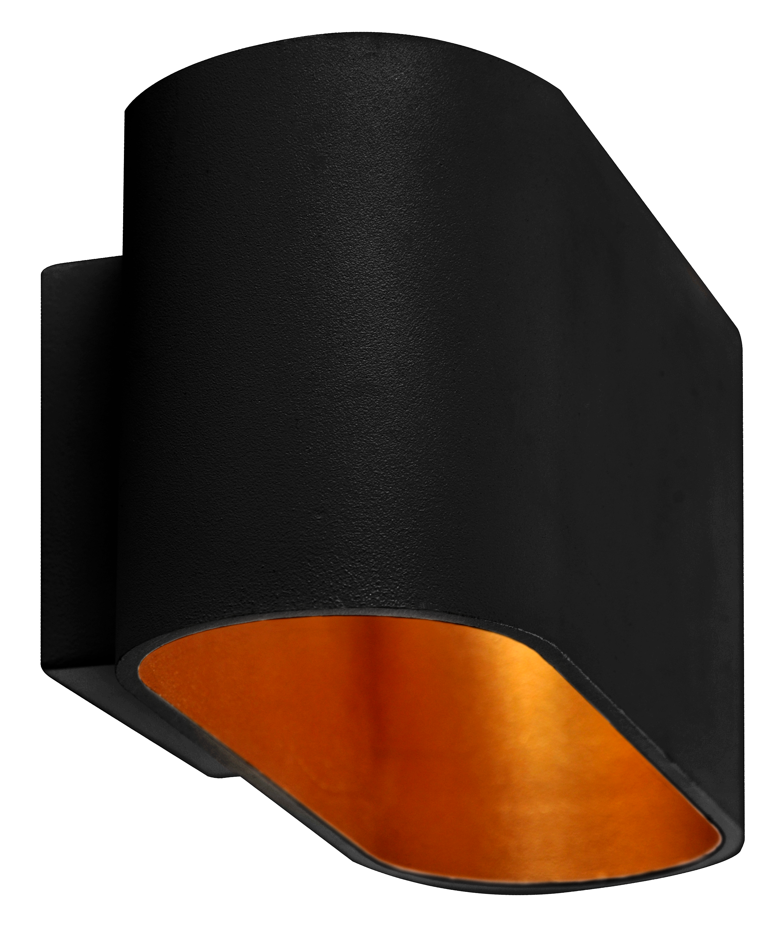 Kinkiet ścienny w kolorze czarnym od wewnątrz wykończony złotym kolorem, wykonany z aluminium. Elegancka oprawa mocowana do ściany ozdobi wnętrza naszych domów i mieszkań. Kinkiet posiada jedno wymienne źródło światła na gwint G9 max 10W LED, IP20.