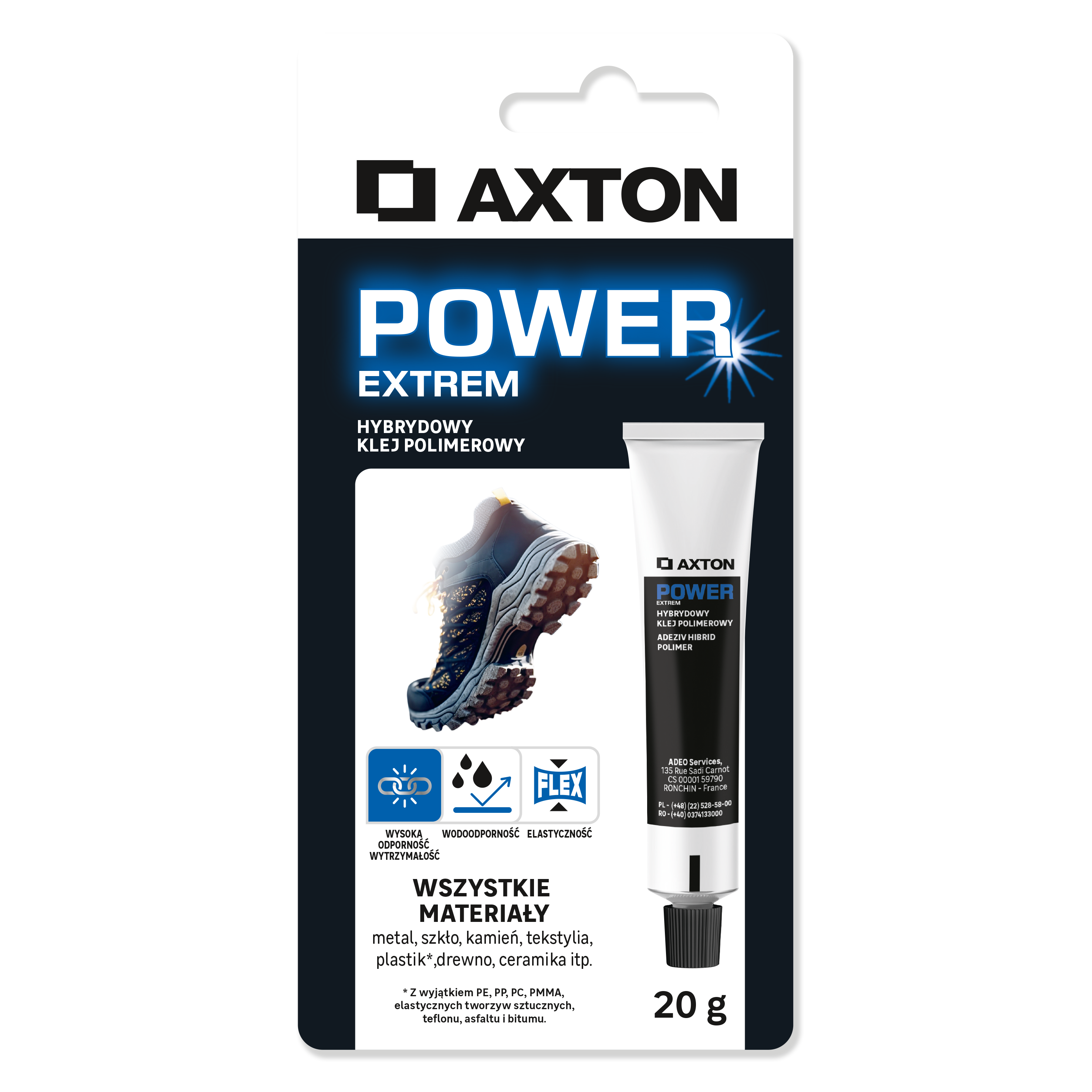 Klej Axton Hybrid Polymer Power Extrem jest idealny do wszystkich codziennych połączeń i napraw wymagających ostatecznego połączenia. Jego hybrydowa formuła polimerowa zapewnia wysoką odporność na wstrząsy, wibracje, złą pogodę, wahania temperatury i promieniowanie UV. Jego przyczepność do wszystkich rodzajów materiałów (cegła, beton, kamień naturalny, metal, drewno i pochodne, skóra, tkanina, ceramika, porcelana, szkło, plastik itp.) i jego elastyczność sprawiają, że klej Power Extrem jest idealny do przyklejania i przyklejania do wszystkich rodzajów powierzchni.