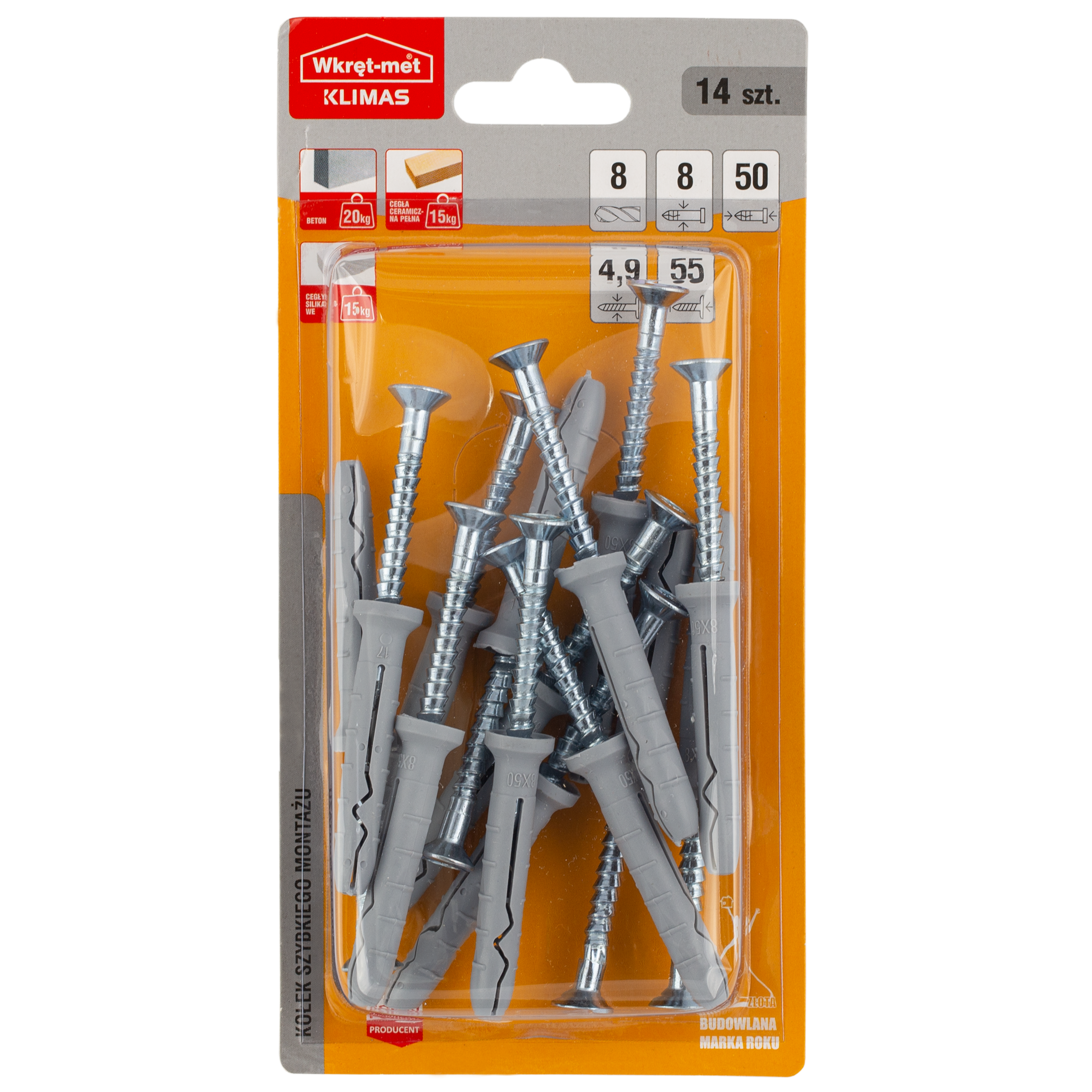 | Zawartość zestawu | 14 szt. Kołek 8x50 mm, 14 szt. Wkręt 4,9x55 mm |