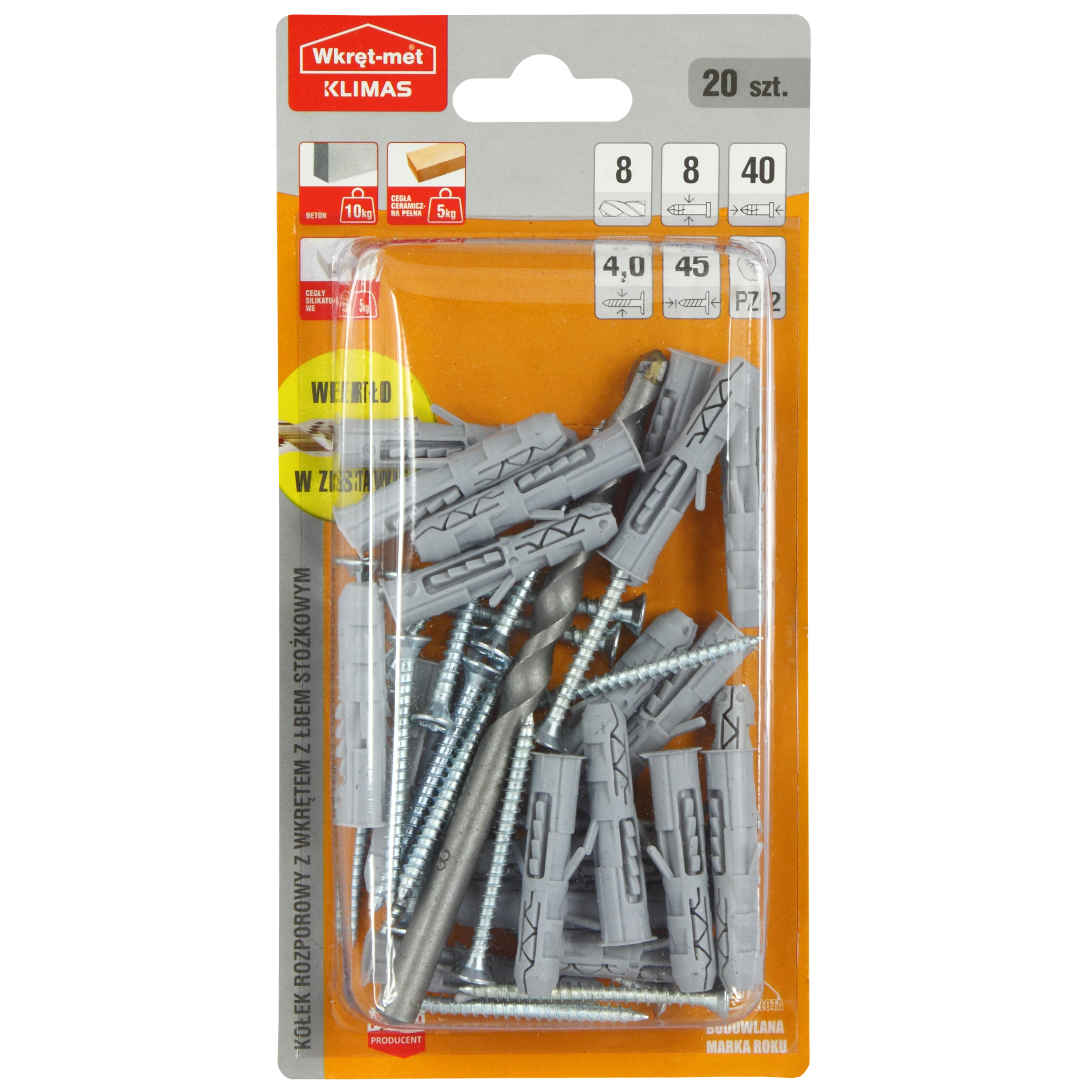 | Zawartość zestawu | 20 szt. Kołek, 20 szt. Wkręt, 1 szt. Wiertło |