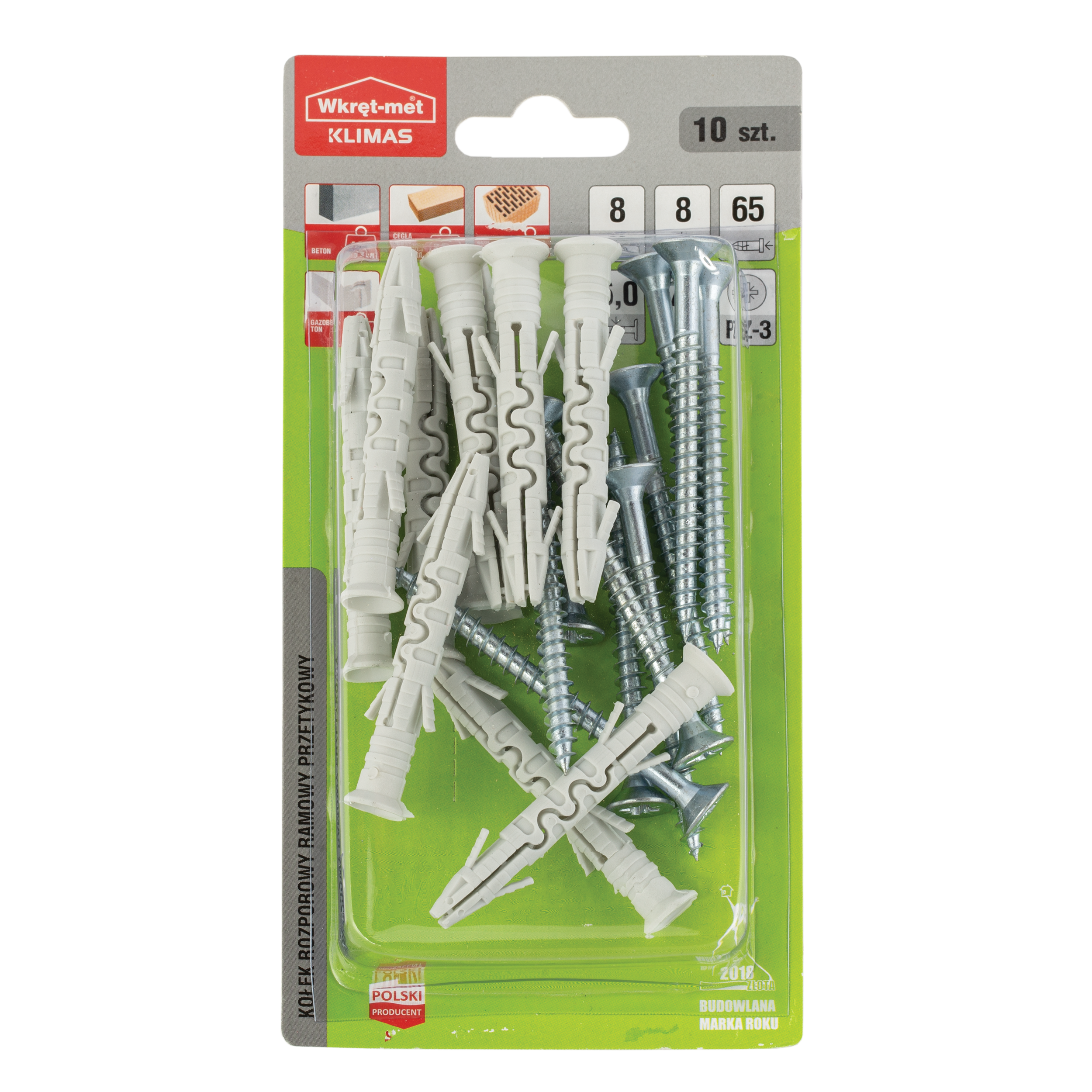 Kołek ramowy 8 x 65 mm 10 szt. Wkręt-met pozwala na mocowanie różnego rodzaju elementów, zarówno wykończeniowych, konstrukcyjnych a także wszelkich urządzeń. Stosowanie jest banalnie proste - wystarczy umieścić kołek w przygotowanym wcześniej otworze montażowym a następnie wkręcić dołączony wkręt lub śrubę. Poprawne i trwałe mocowanie za pomocą tego łącznika jest możliwe tylko przy zastosowaniu się do instrukcji umieszczonej na opakowaniu (średnica i głębokość otworu, grubość mocowanego elementu, rodzaj podłoża, przewidywane obciążenie).