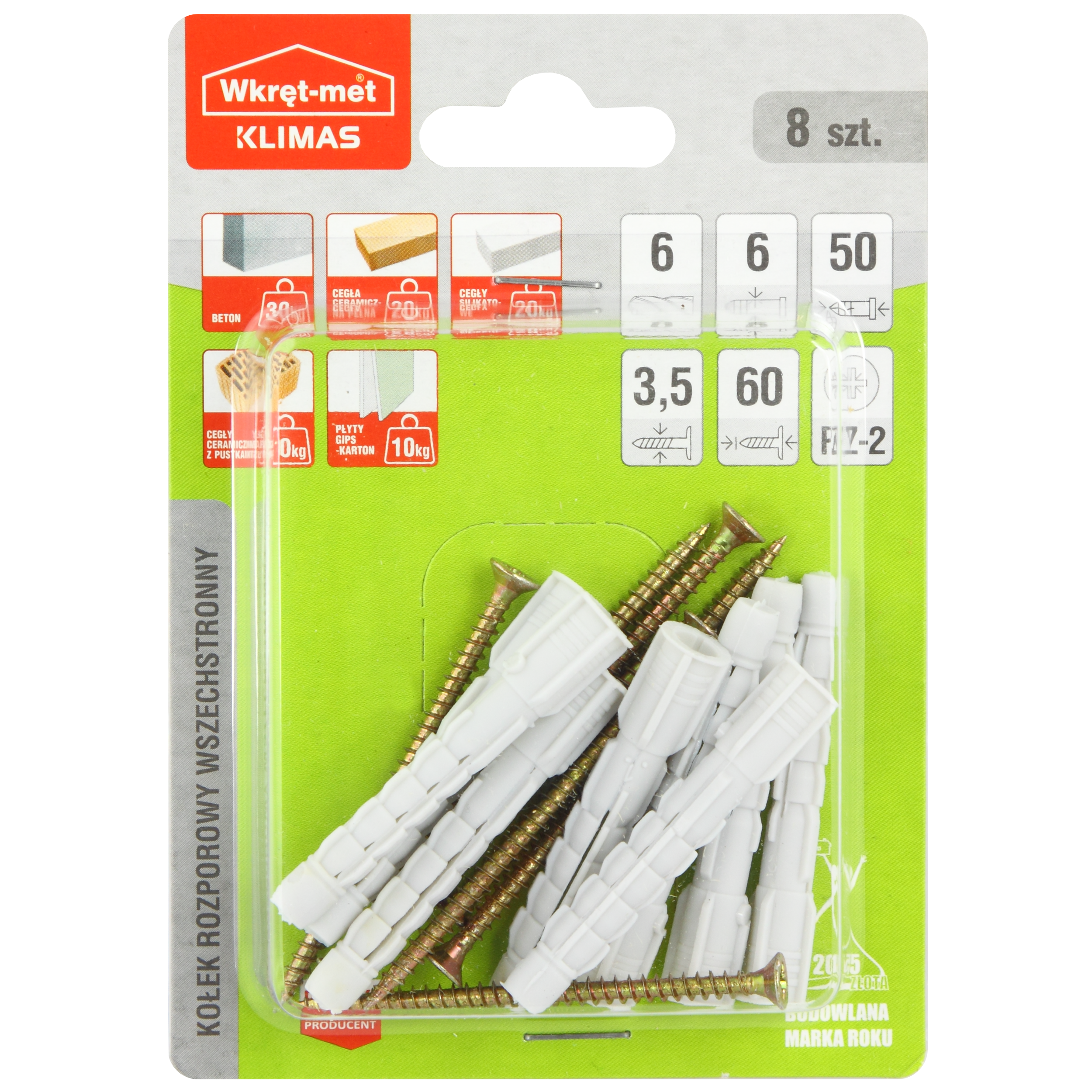 Kołek uniwersalny 6 x 60 mm 8 szt. Wkręt-met pozwala na pewne mocowanie różnego rodzaju elementów, zarówno dekoracyjnych, wykończeniowych jak i konstrukcyjnych. Stosowanie jest banalnie proste - wystarczy umieścić kołek w przygotowanym wcześniej otworze montażowym a następnie wkręcić dołączony łącznik (wkręt lub śruba). Poprawne i trwałe mocowanie jest możliwe tylko przy odpowiednim doborze produktu i wykonaniu otworów montażowych zgodnie ze wskazaniami na opakowaniu (średnica i głębokość otworu, grubość mocowanego elementu, rodzaj podłoża, przewidywane obciążenie).