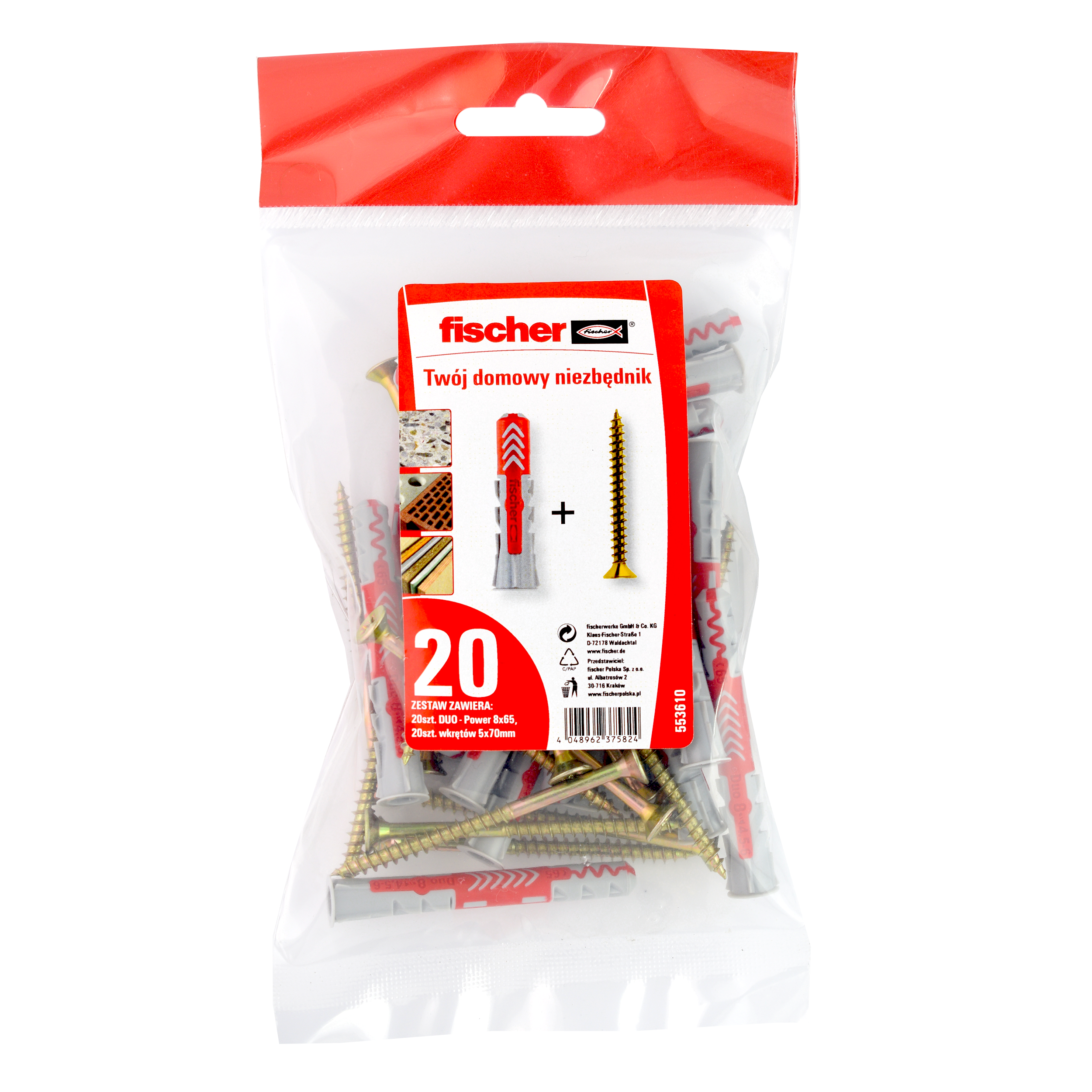 Kołki uniwersalne 8 x 65 mm 20 szt. Duopower Fischer pozwala na pewne mocowanie różnego rodzaju elementów, zarówno dekoracyjnych, wykończeniowych jak i konstrukcyjnych. Stosowanie jest banalnie proste - wystarczy umieścić kołek w przygotowanym wcześniej otworze montażowym a następnie wkręcić dołączony łącznik (wkręt lub śruba). Poprawne i trwałe mocowanie jest możliwe tylko przy odpowiednim doborze produktu i wykonaniu otworów montażowych zgodnie ze wskazaniami na opakowaniu (średnica i głębokość otworu, grubość mocowanego elementu, rodzaj podłoża, przewidywane obciążenie).