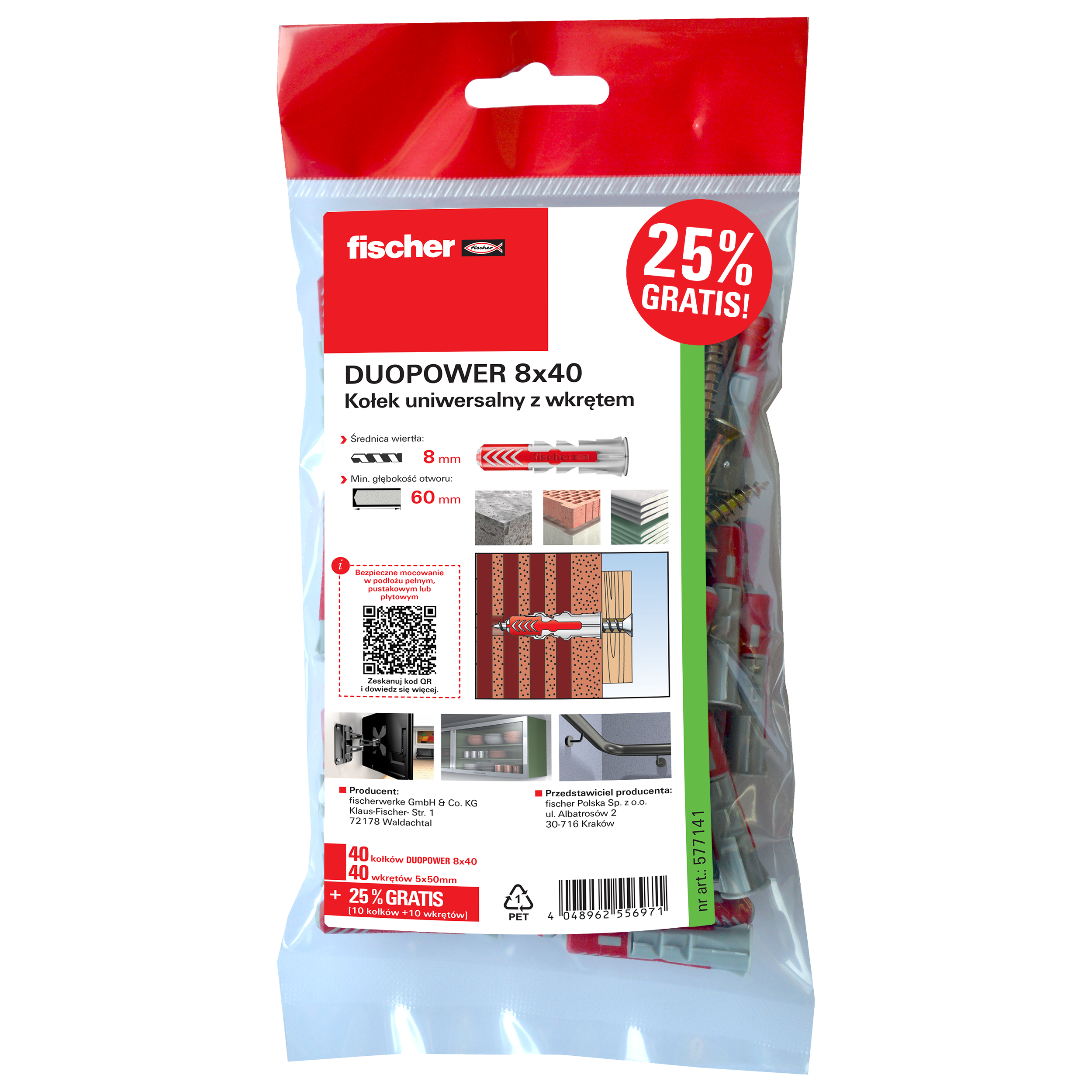 DUOPOWER to inteligentny, 2-składnikowy kołek pełniący trzy funkcje. Inteligentny, uniwersalny kołek do mocowań we wszystkich podłożach budowlanych. Dzięki temu ten sam kołek znajduje szersze zastosowanie. Kołek DUOPOWE automatycznie dopasowuje się do materiału budowlanego podłoża i przekazuje maksymalne obciążenia realizując trzy funkcje: składanie, rozpieranie i zwijanie (zapętlanie). Bezpieczeństwo zwiększa bardzo dobry docisk kołka przy wkręcaniu. Dzięki zwiększonej głębokości kotwienia, kołki DuoPower 6 x 50, 8 x 65, są szczególnie przydatne w mocowaniu w podłożu pustakowym, gazobetonie i tynku.