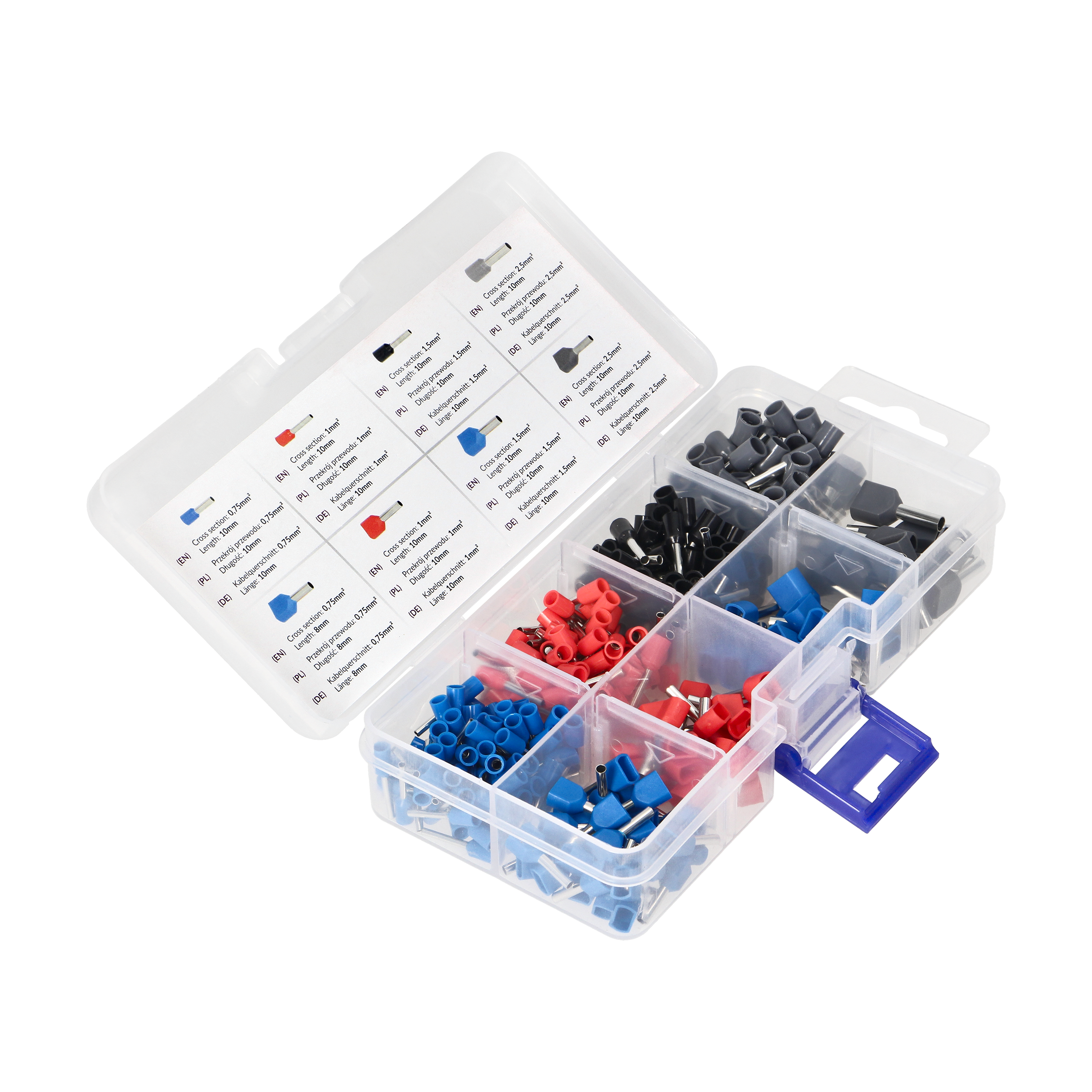 Zestaw tulejek izolowanych do zaciskania na końcach przewodów. Tulejki pozwalają na wykonanie estetycznego i pewnego zakończenia przewodu. Dzięki zastosowaniu tulejki możemy stosować przewód typu linka w szybkozłączkach wciskanych oraz poprawić jakość połączenia śrubowego. Zawiera 350 elementów - tulejki pojedyncze: 0,75mm x 2,10mm - 80 szt. 1mm2 x 10mm: 70 szt. 1,5mm2 x 10mm: 60 szt. 2,5mm2 x 10mm: 50 szt. oraz tulejki podwójne: 0,75mm2 x 8mm: 30 szt. 1mm2 x 10mm: 25 szt. 1,5mm2 x 10mm: 20 szt. 2,5mm2 x 10mm: 15 szt.