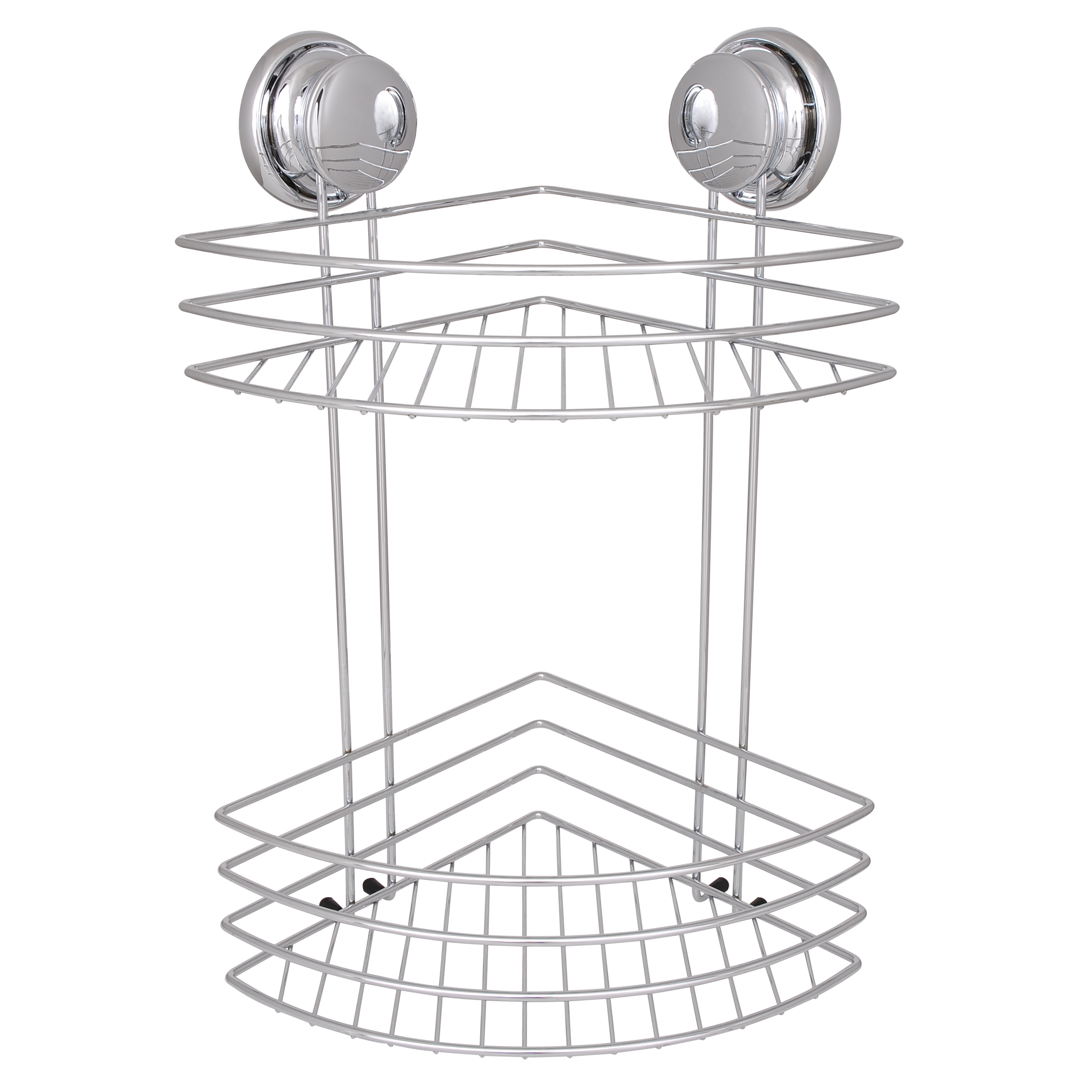 Narożny koszyk łazienkowy z chromowanej stali, mocowany na przyssawki. Koszyk wyposażony jest w dwa kosze i w dwie duże przyssawki oraz nóżki z gumowanymi odbojnikami, które znajdują się pod przyssawkami i zapewniają solidne, równomierne trzymanie. Sprawdzi się na matowych, porowatych gresach - struktura przyssawki przypomina bardzo gęsty żel i tym samym szczelnie wnika w porowate powierzchnie. Jest skuteczna również na glazurach, laminatach, lodówkach, szkle i innych gładkich powierzchniach.