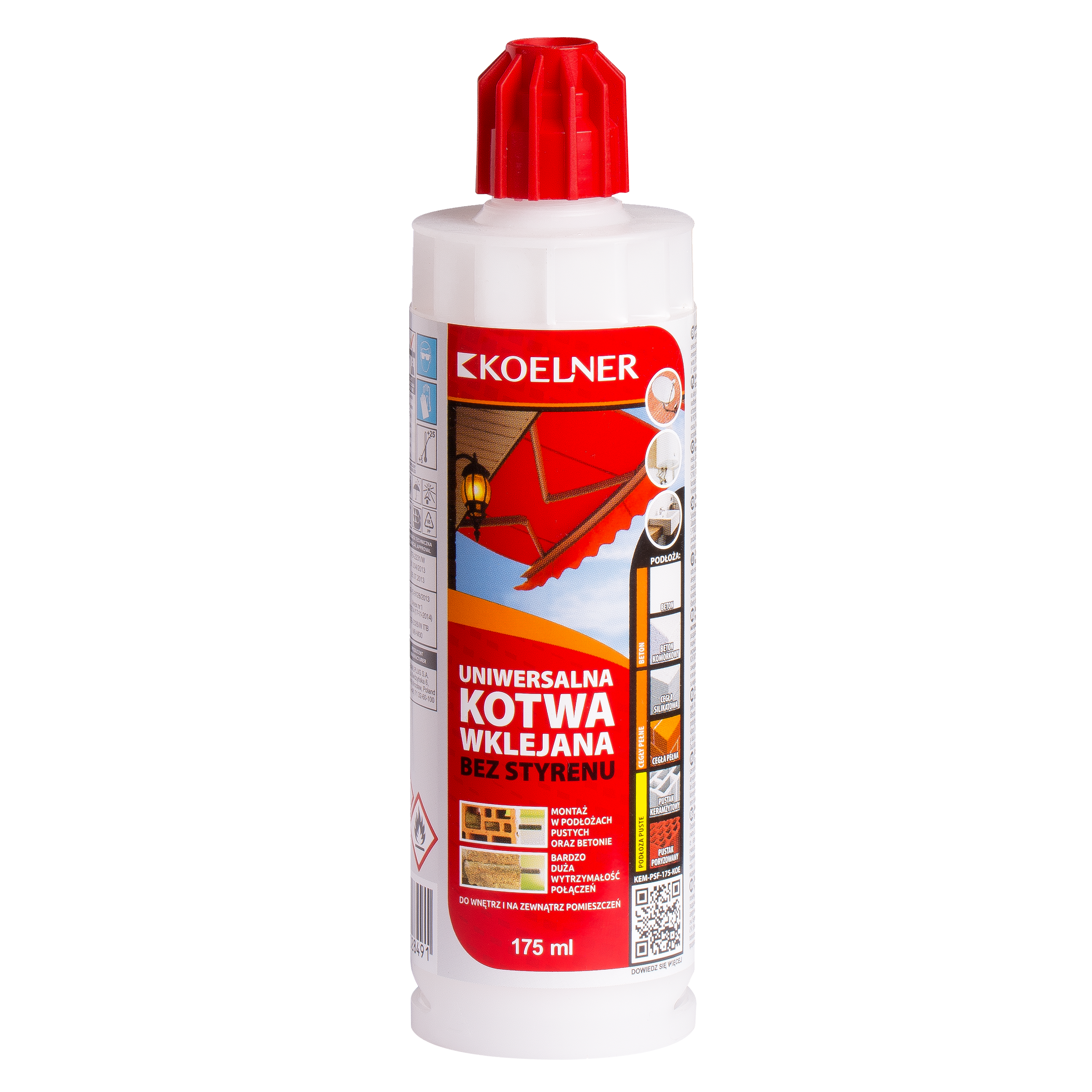 Kotwa chemiczna poliestrowa Koelner to kotwa wklejana poliestrowa bez styrenu wysokiej jakości, rekomendowana do średnich obciążeń, do zamocowań w betonie niespękanym. Certyfikowane do: cegły otworowej, cegły pełnej, cegły silikatowej drążonej, cegły silikatowej pełnej, pustaku z betonu lekkiego i gazobetonu. Aplikacje: bramy, elementy okienne, zadaszenia, urządzenia sanitarne, relingi, poręcze, wsporniki, drabiny, koryta kablowe. Najbardziej uniwersalna kotwa wklejana ogólnego zastosowania. Produkt o szerokim spektrum zastosowań w zakresie obciążeń o średnim stopniu bezpieczeństwa. Idealny do aplikacji, gdzie nie ma możliwości wykonania kotwienia mechanicznego. Łatwe dozowanie dzięki opatentowanemu systemowi samootwierania oraz zastosowaniu dozowników manualnych lub elektrycznych. Możliwość zastosowania standardowego dozownika manualnego - silikonowego. Nadaje się do wielokrotnego użytku. Produkt częściowo wykorzystany może być ponownie aplikowany po uprzedniej instalacji nowej dyszy. 18 miesięcy przydatności do użycia.
