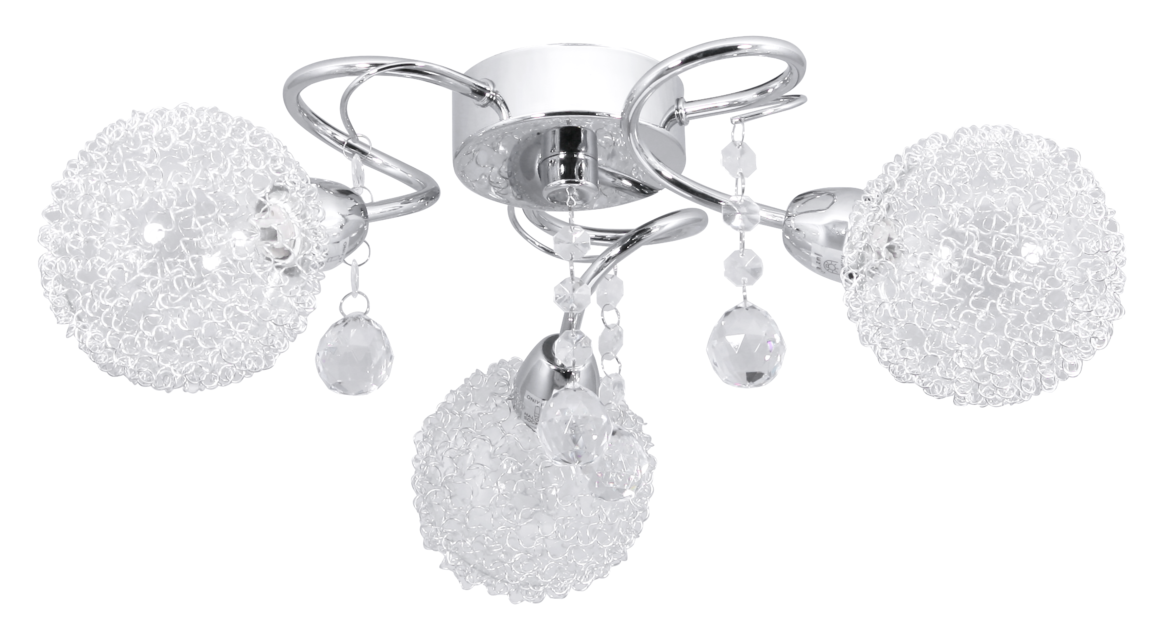 Vesna - plafon 3 płomienny chrom. Bez żarówek. Klosze szklane 10cm oplecione aluminiowa siatką. Zawiesia ozdobne z akrylu.
