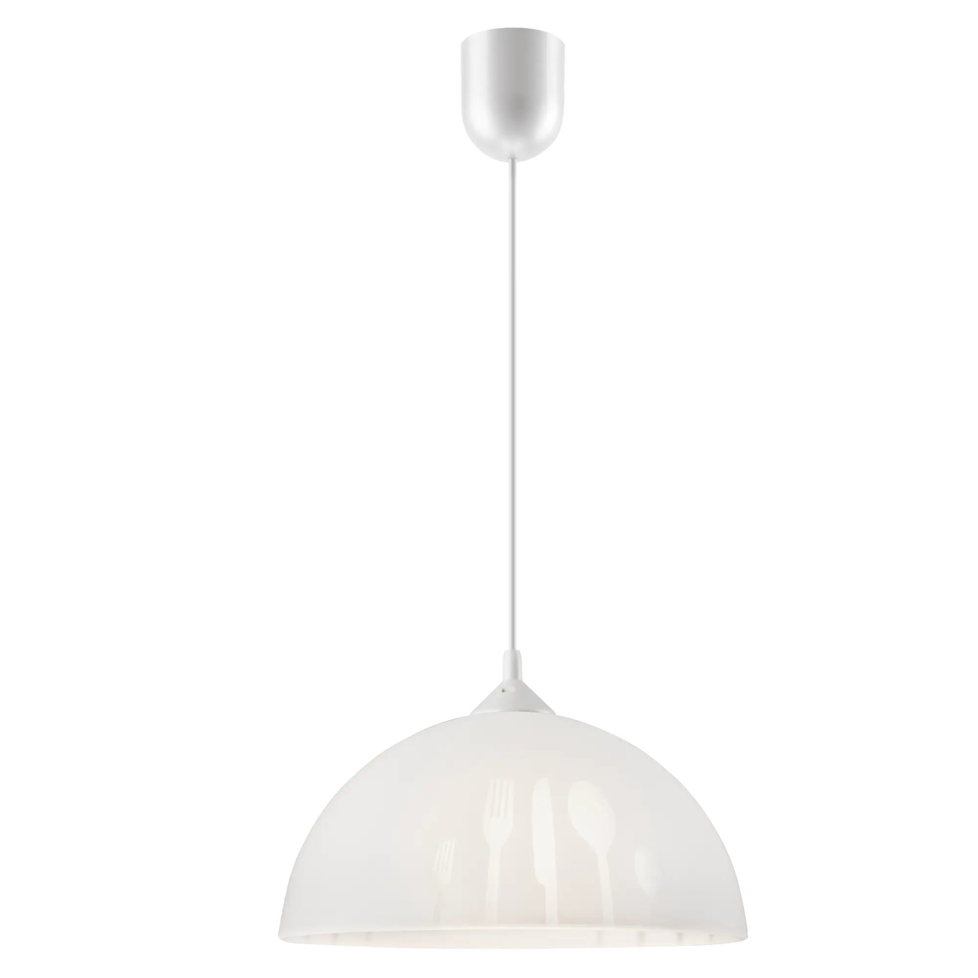 Klosz lampy wiszącej APETITE wykonano ze szkła, które równomiernie rozprasza i zmiękcza emitowane światło dzięki pokryciu matowym lakierem. W ten sposób powstaje przytulny, przyjemny efekt świetlny, odpowiedni do spożycia posiłku czy wspólnego spędzania czasu w kuchni. Dekor dodatkowo nawiązuje do funkcji jaka jest przeznaczona dla tego modelu. Montaż lampy do sufitu odbywa się za pomocą oczka ukrytego w podsufitce, na suficie należy wówczas zamontować hak.