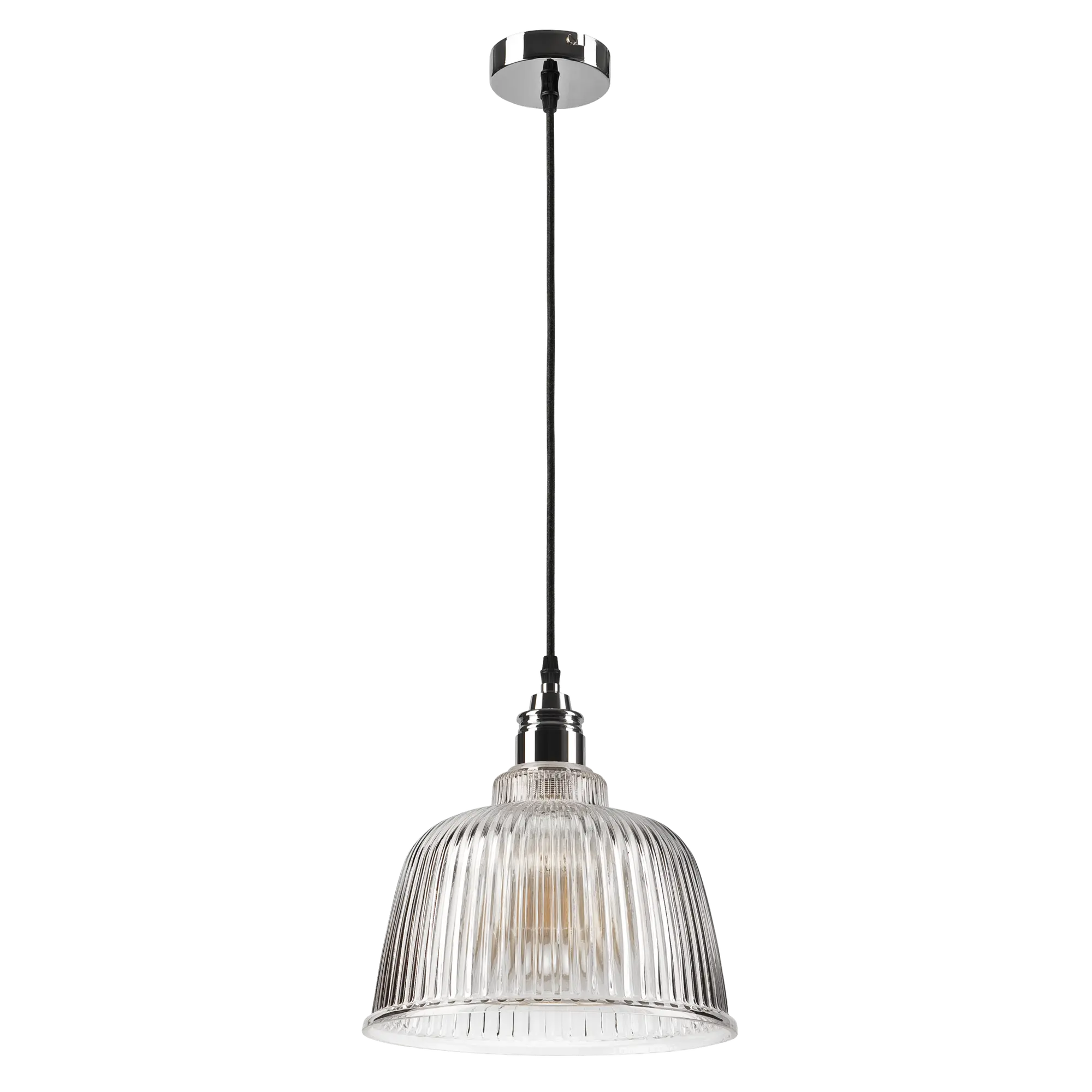 Lampa wisząca jednopunktowa ASTA składa się ze szklanego transparentnego klosza o kaskadowym kształcie oraz oprawki dekoracyjnej. Szkło jest ryflowane pionowo. Zastosowane na oprawce elementy oraz kolorystyka - chrom w połączeniu z czarnym matem daje efekt typowy dla stylu przemysłowego. Montaż do powierzchni odbywa się za pomocą metalowego wspornika ukrytego w puszce montażowej. Przenikalność światła przez klosz jest nieograniczona dlatego lampa ma duże możliwości oświetlenia pomieszczenia. W związku z tym, może być zastosowana w każdego typu pomieszczeniach według indywidualnych preferencji.